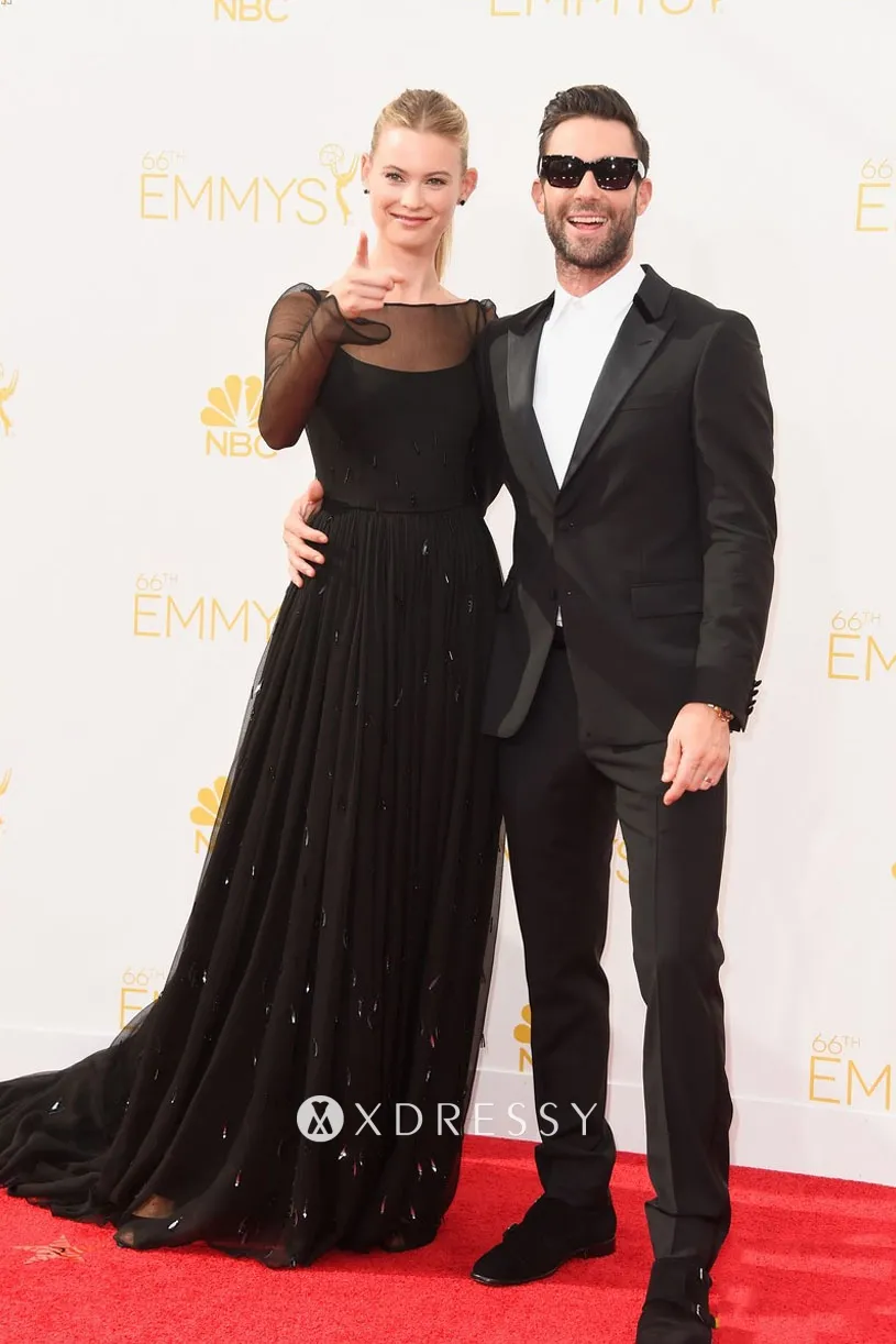 Adam Levine kept it cool in a suit and sunglasses at the 2014 Emmy Awards. His wife Behati Prinsloo wore an illusion neckline long-sleeve black formal gown.