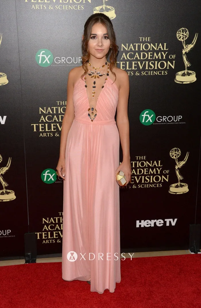 Cat Deeley is pretty in a pink v-neck dress at the 2014 Emmy Awards held at the Nokia Theatre L.A. Live on Monday (August 25) in Los Angeles.