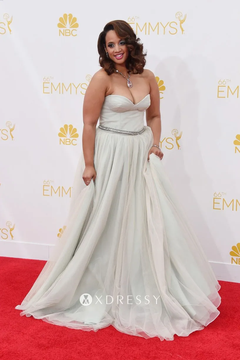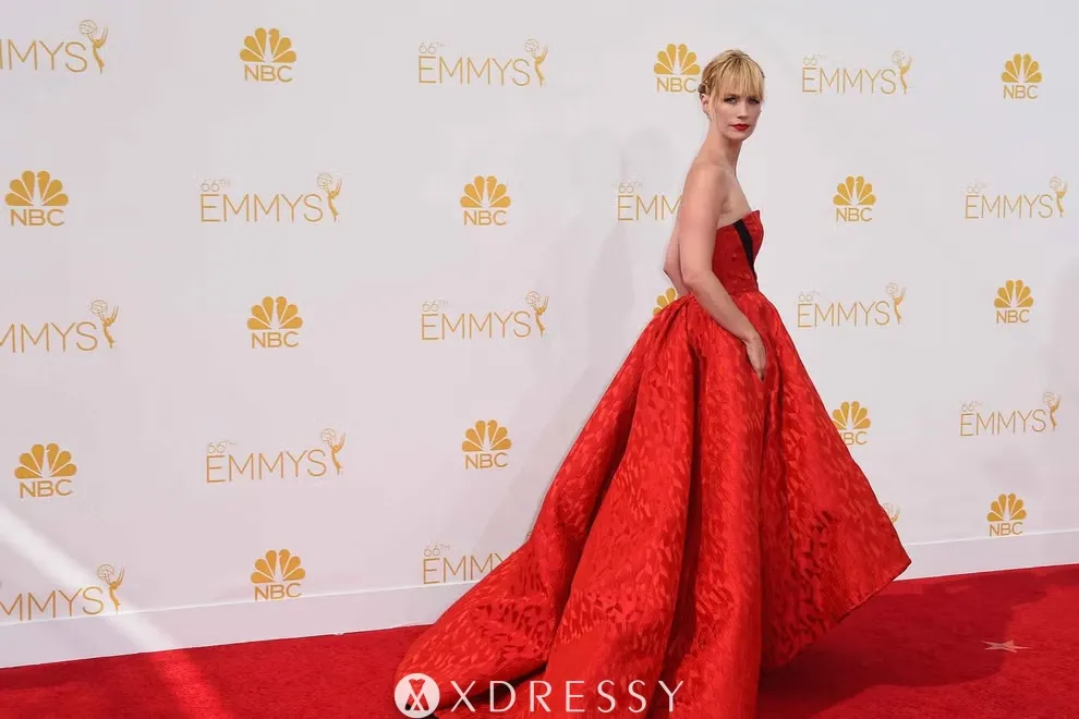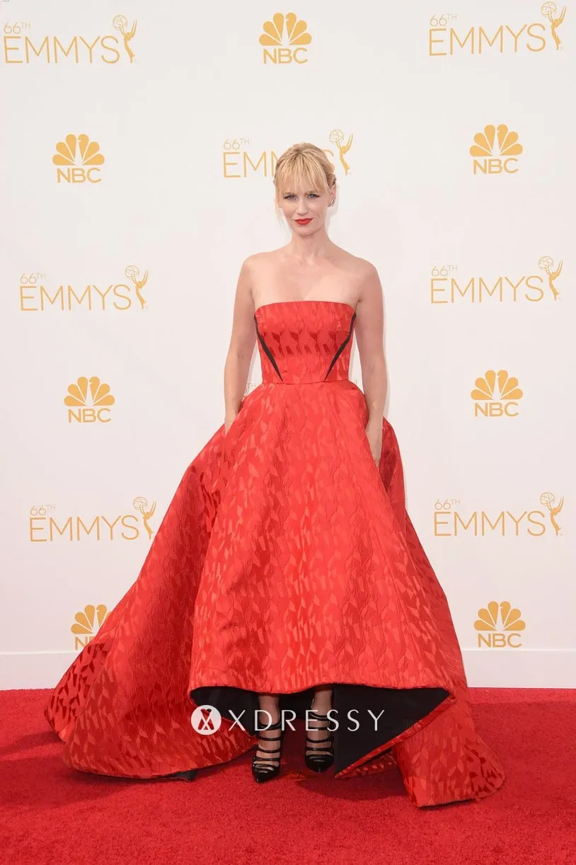 January Jones absolutely stuns in a gorgeous red strapless ball gown on the red carpet at the 2014 Emmy Awards held at the Nokia Theatre L.A. Live on Monday (August 25) in Los Angeles.