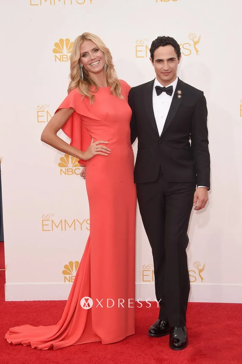Heidi Klum and designer Zac Posen take the red carpet together for the 2014 Emmy Awards. Heidi is wearing a watermelon formal gown, Jimmy Choo shoes, and Lorraine