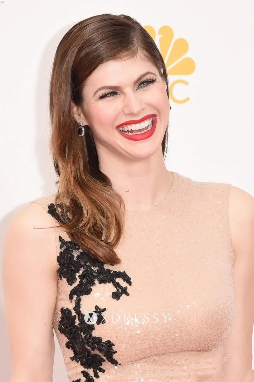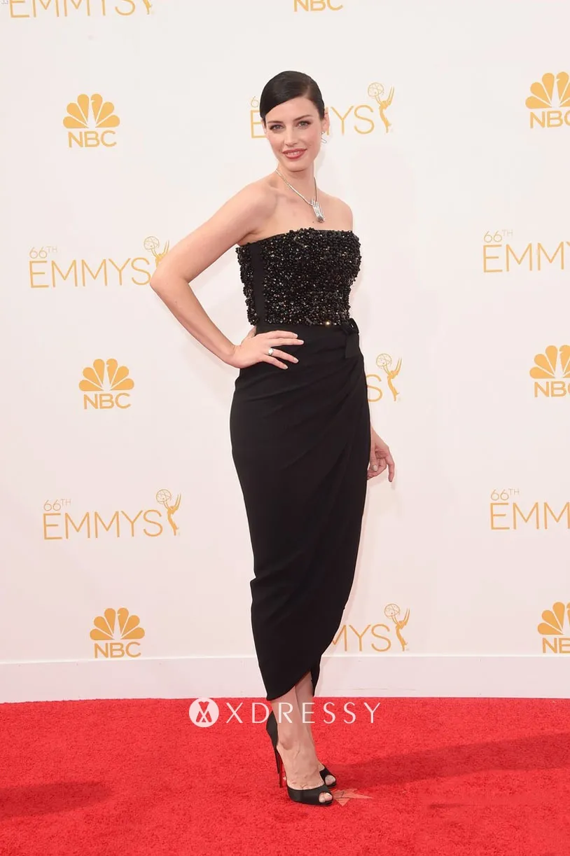 Lena Headey, aka Queen Cersei of ‘Game of Thrones,’ decided to go dark for the 2014 Emmy Awards. Her black damask gown featured an asymmetrical neck and hemline. Additional details included a tucked bodice and a full pleated skirt. Lena softened her edgy look with peep-toe pumps, tousled short hair, and peachy lips.