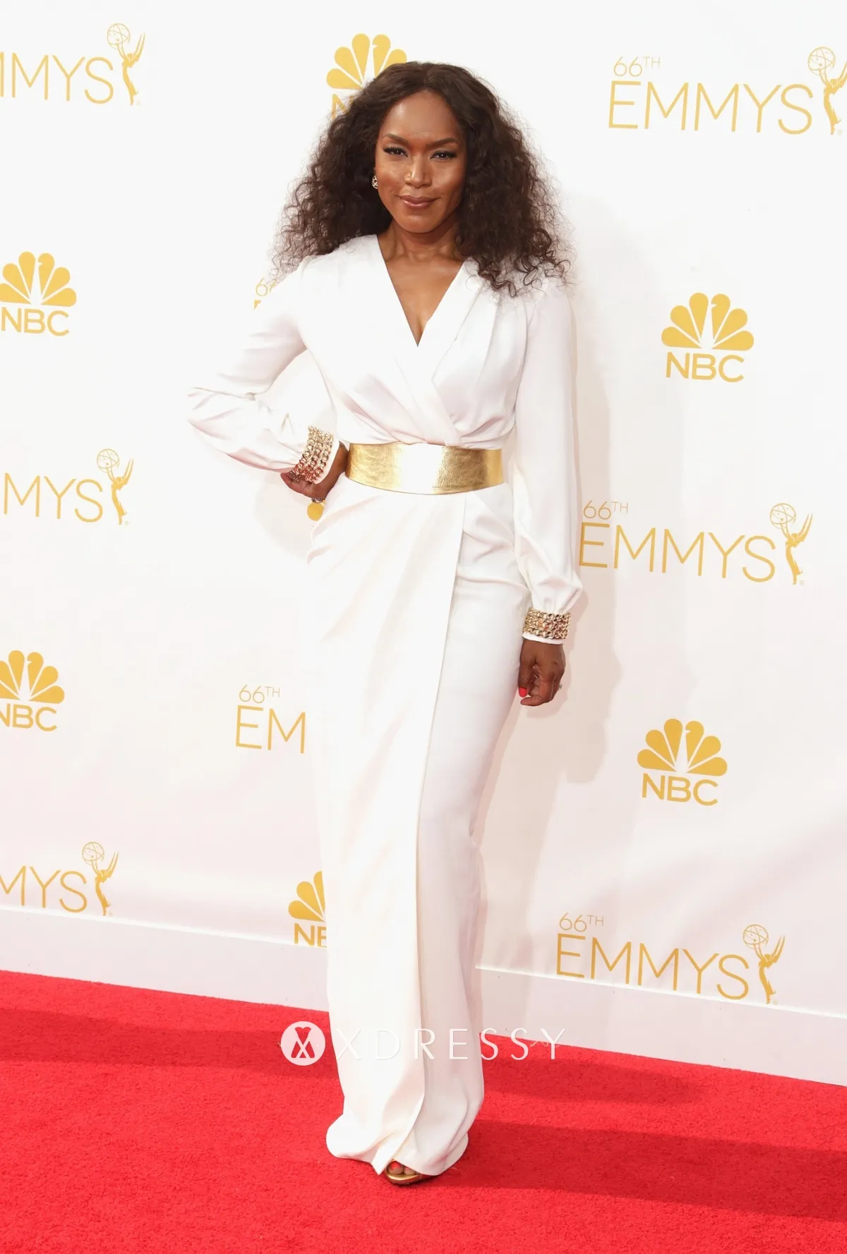 Padma Lakshmi is pretty in a white formal gown at the 2014 Emmy Awards. Stuart Weitzman shoes, Jimmy Choo clutch, Bvlgari bracelets.