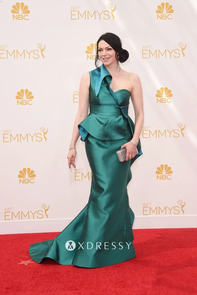 Laura Prepon looks lovely in a turquoise one-shoulder mermaid formal gown on the red carpet at the 2014 Emmy Awards. She accessorized with a Judith Leiber clutch, Jimmy Choo shoes, and Simon G jewelry. Dascha is wearing a Johanna Johnson dress and shoes with Sam Lehr jewels.