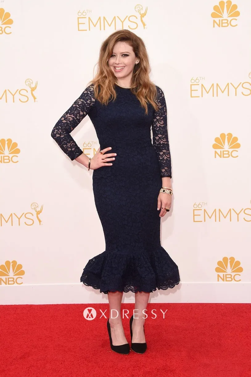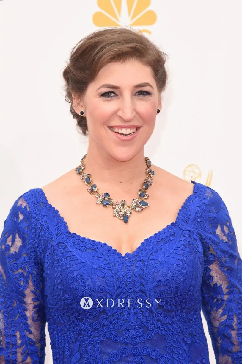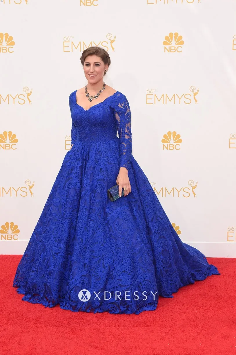 Mayim Bialik looks majestic in a royal blue lace long-sleeve ball gown while arriving at the 2014 Emmy Award.