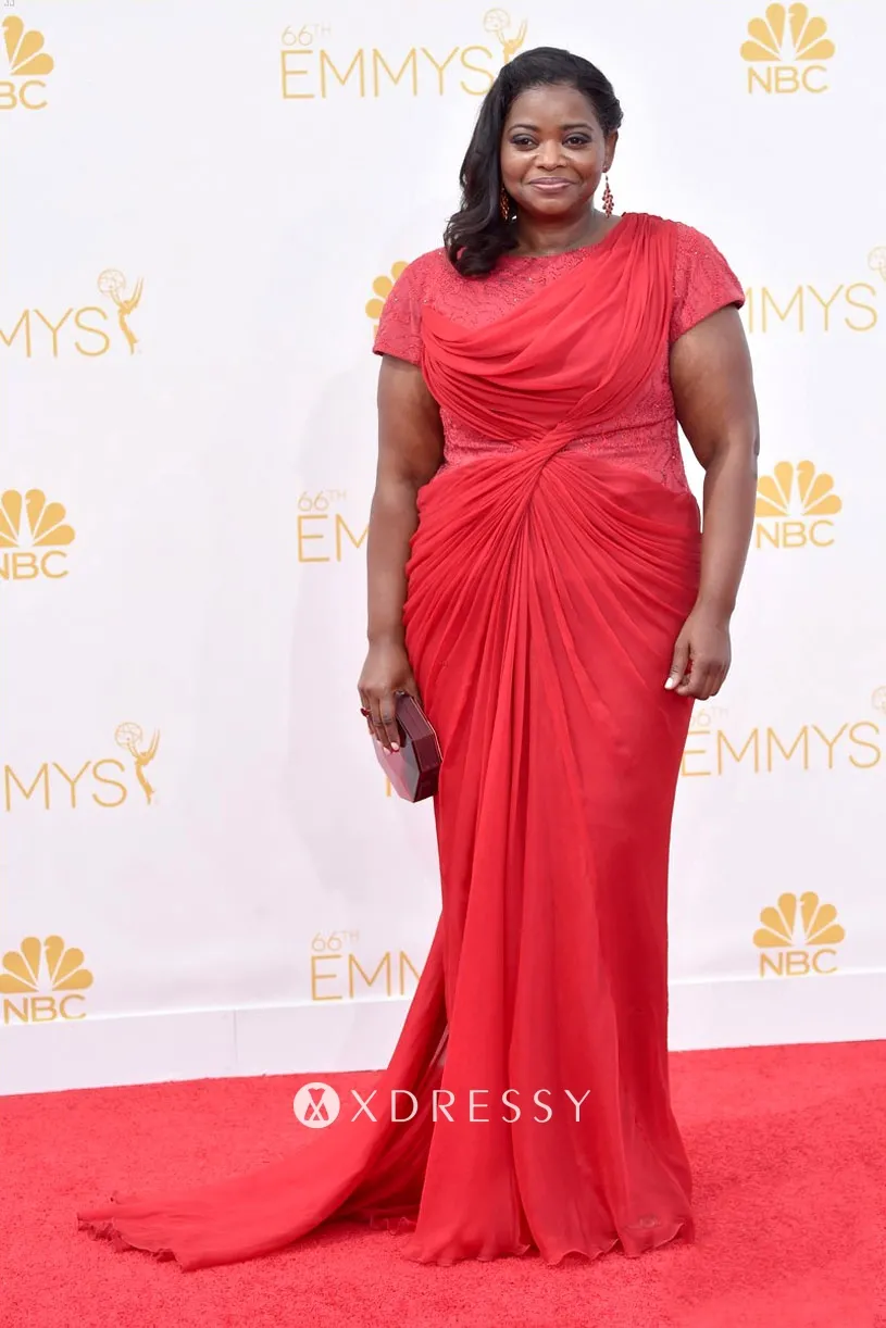 The Homeland actress Octavia Spence stepped out on the Emmys red carpet looking red hot in her short-sleeve formal gown and a matching red lip.