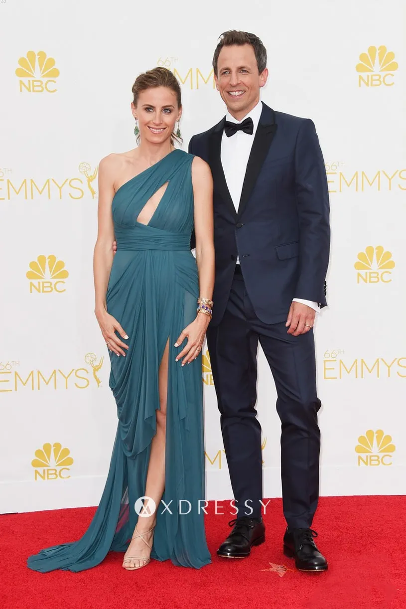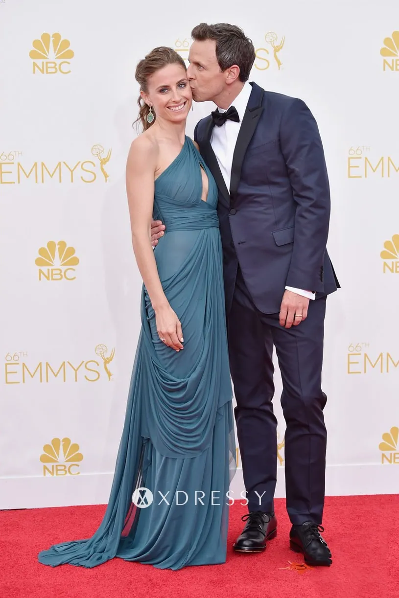 Seth Meyers plants a kiss on his wife Alexi Ashe on the red carpet at the 2014 Emmy Awards, Alexi Ashe is stunning in a teal one-shoulder keyhole formal gown.