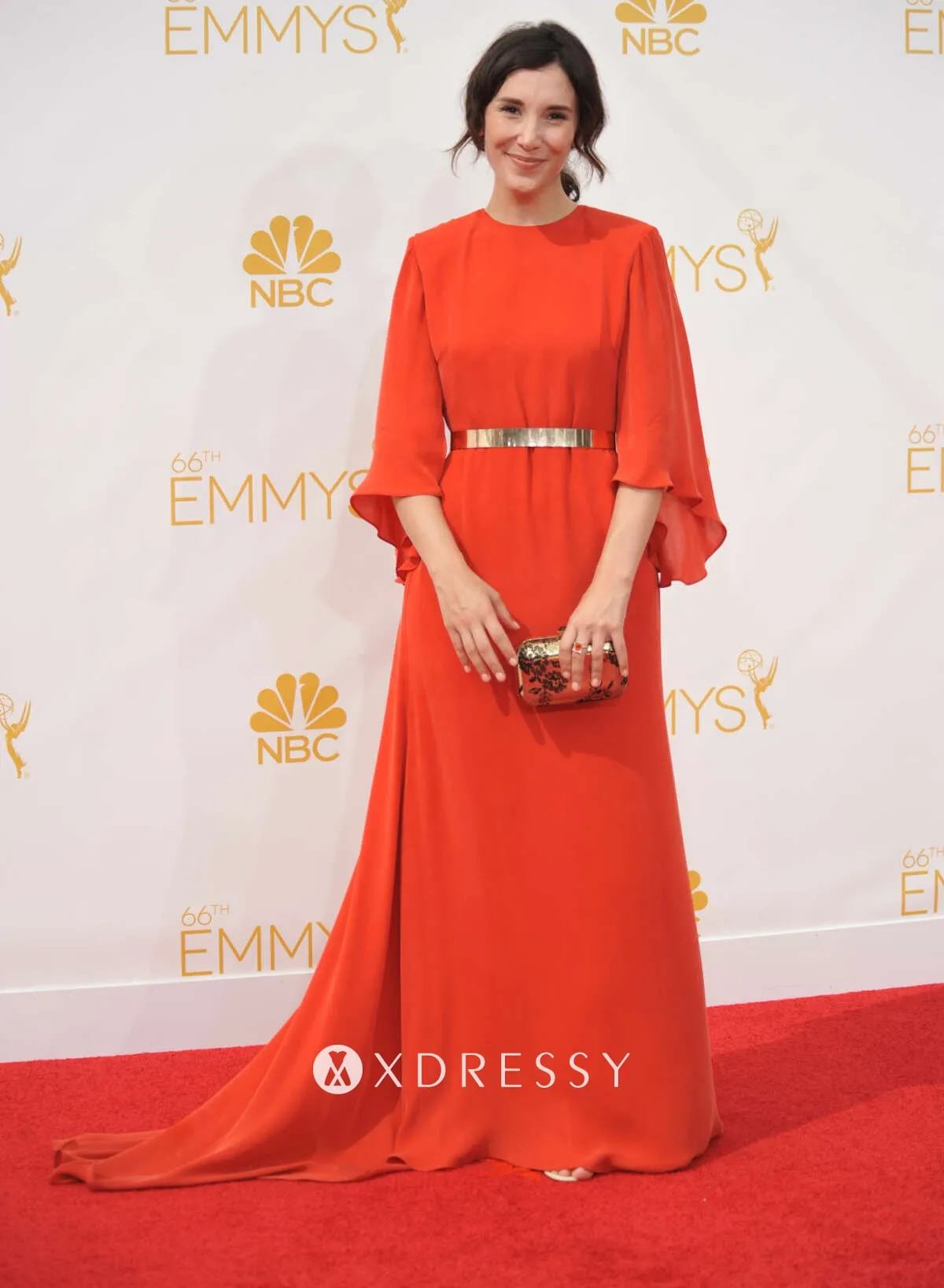 Julie Louis-Dreyfus wore an elegant red column dress that featured asymmetrical pleats at the waist and neckline. The thin red patent belt was echoed by buckled patent straps that crossed Julia’s bare back.