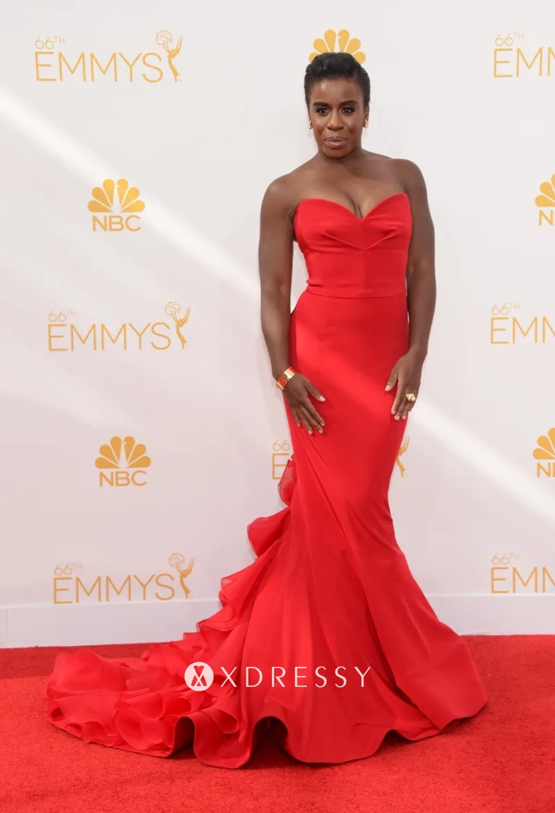 Uzo Aduba donning a red gown, we can't get enough of the ruffled, cascading train! Of course, Aduba completed her outfit with a brilliant braided bun and neutral makeup.