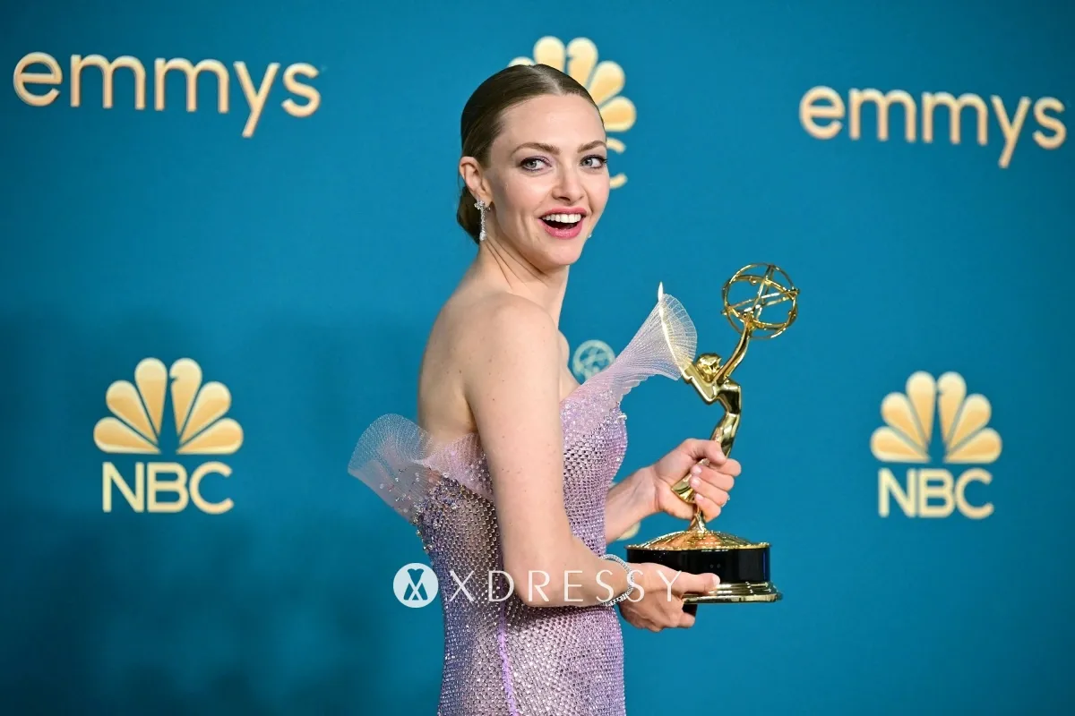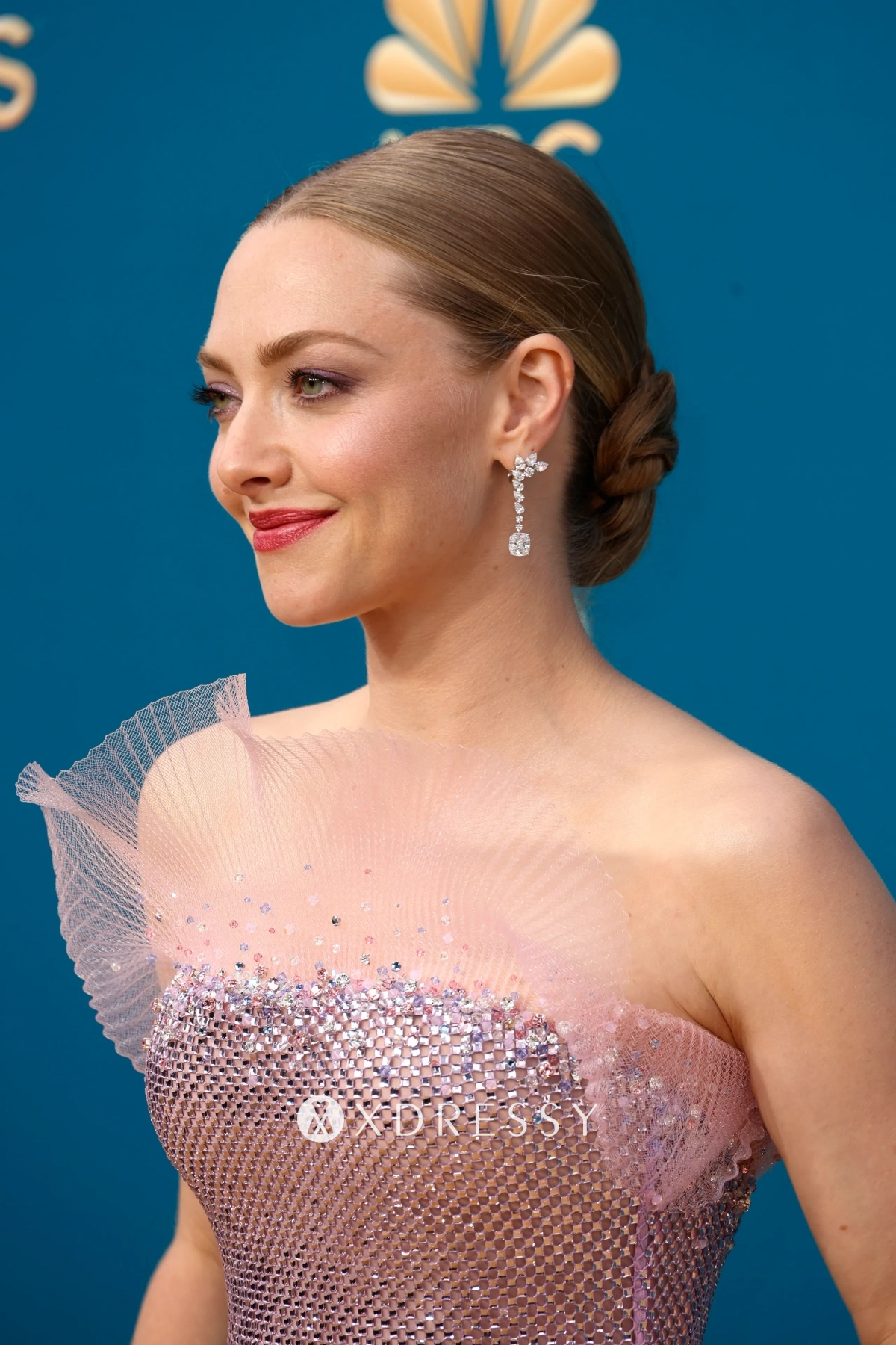 Seyfried wore shimmering sequin sheath celebrity gown with tulle accents at the 2022 Emmy Awards. The strapless dress, complete with multi-dimensional embellished crystals, gave the illusion of mermaid skin. The scalloped tulle accent at the top of the dress added to the cascading and mystical look.