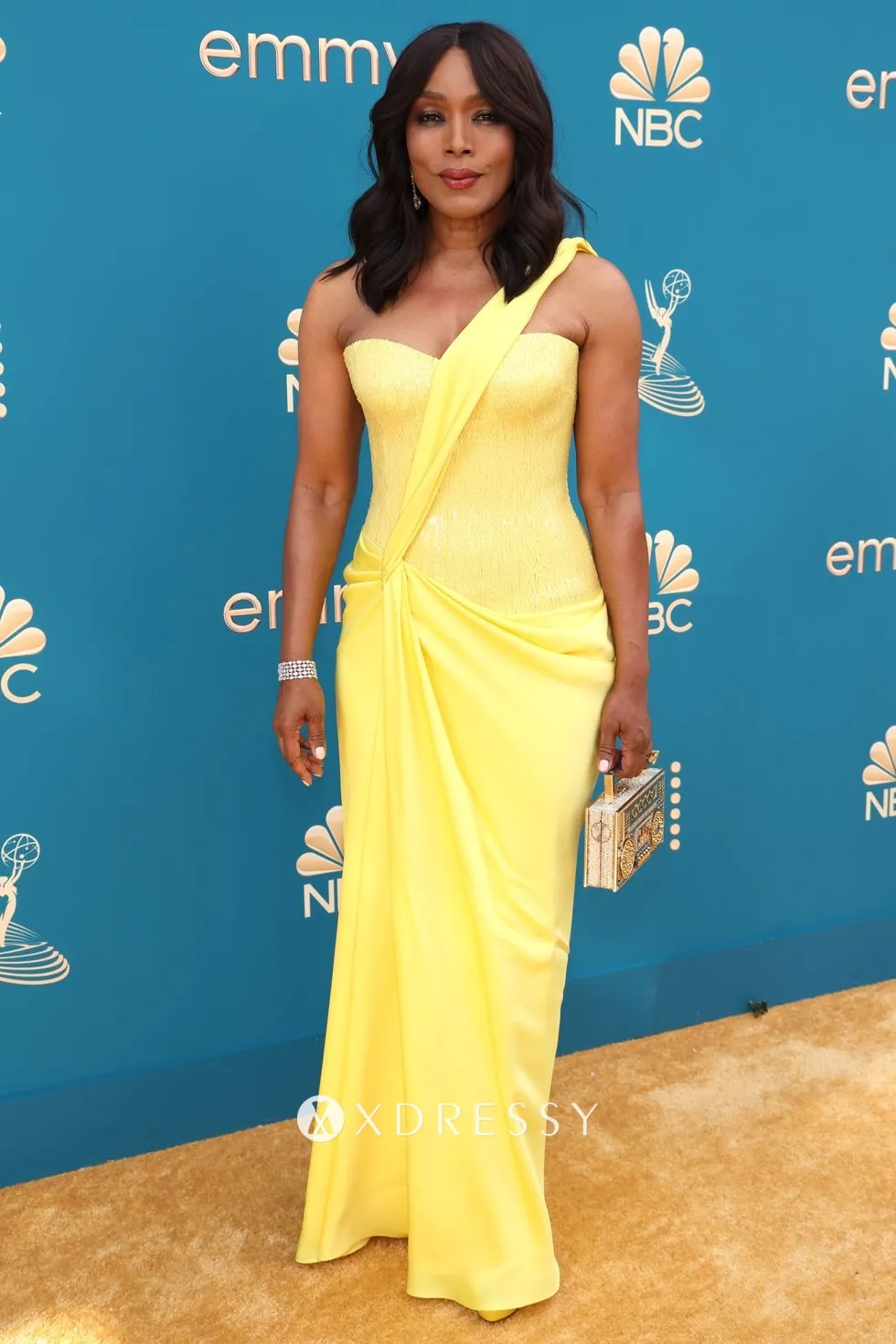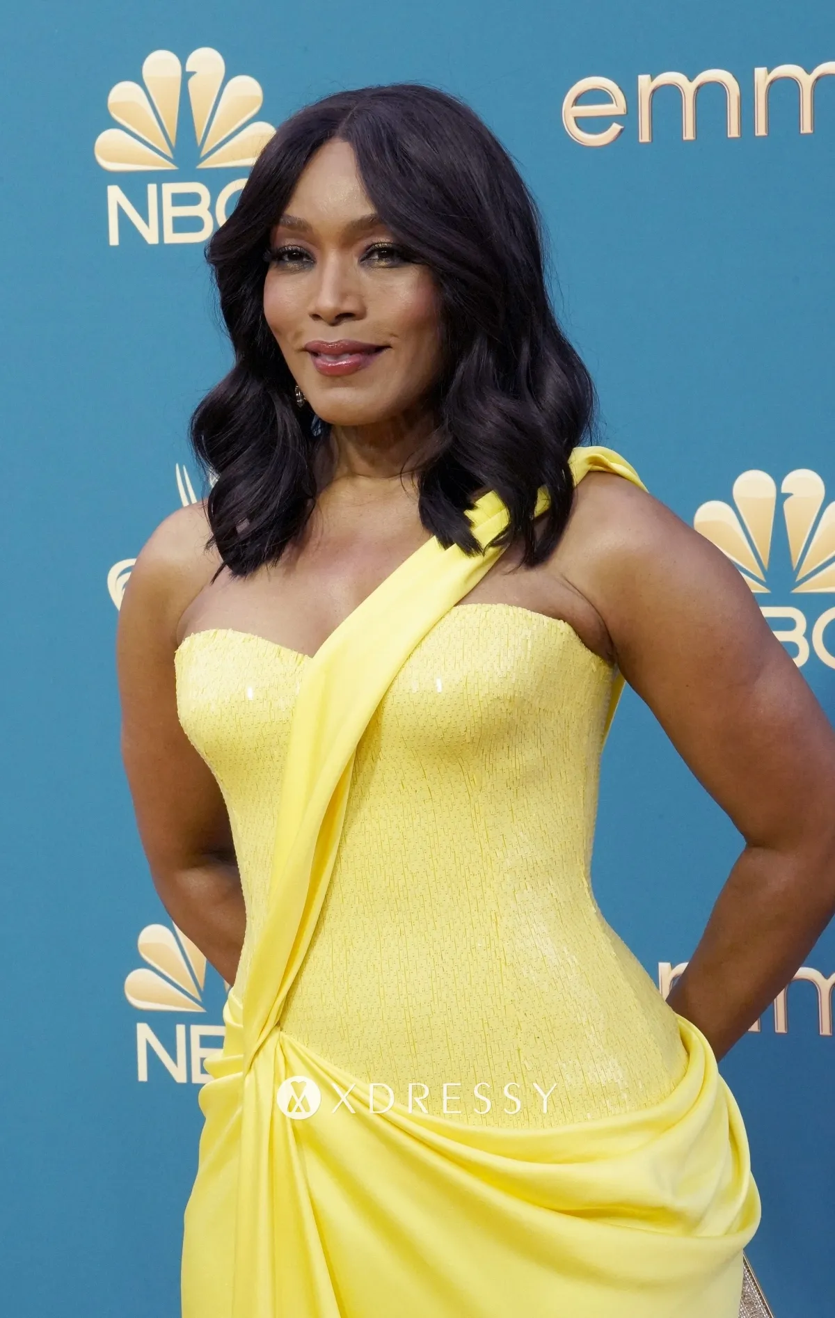 'Black Panther' actress Angela Bassett wore a bright yellow gown while attending the 2022 Primetime Emmys. This bright yellow dress featured a sparkly bodice, satin skirt, matching yellow heels, as well as a sash that goes over her left shoulder and ties into the center part of her dress.