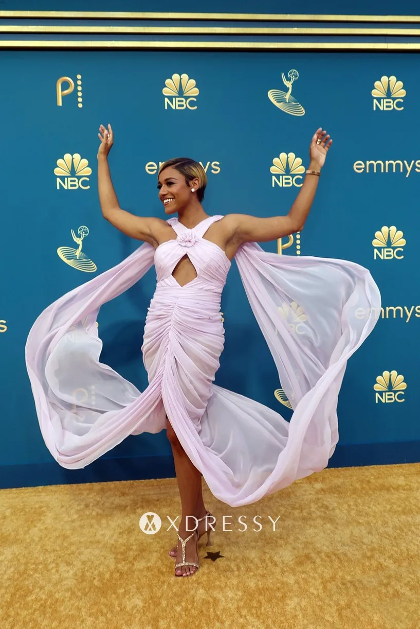 Skye Townsend wore a pretty powder blue evening gown at the 2022 Emmy, the chic dress featuring sweetheart neckline, mermaid silhouette and a high slit.