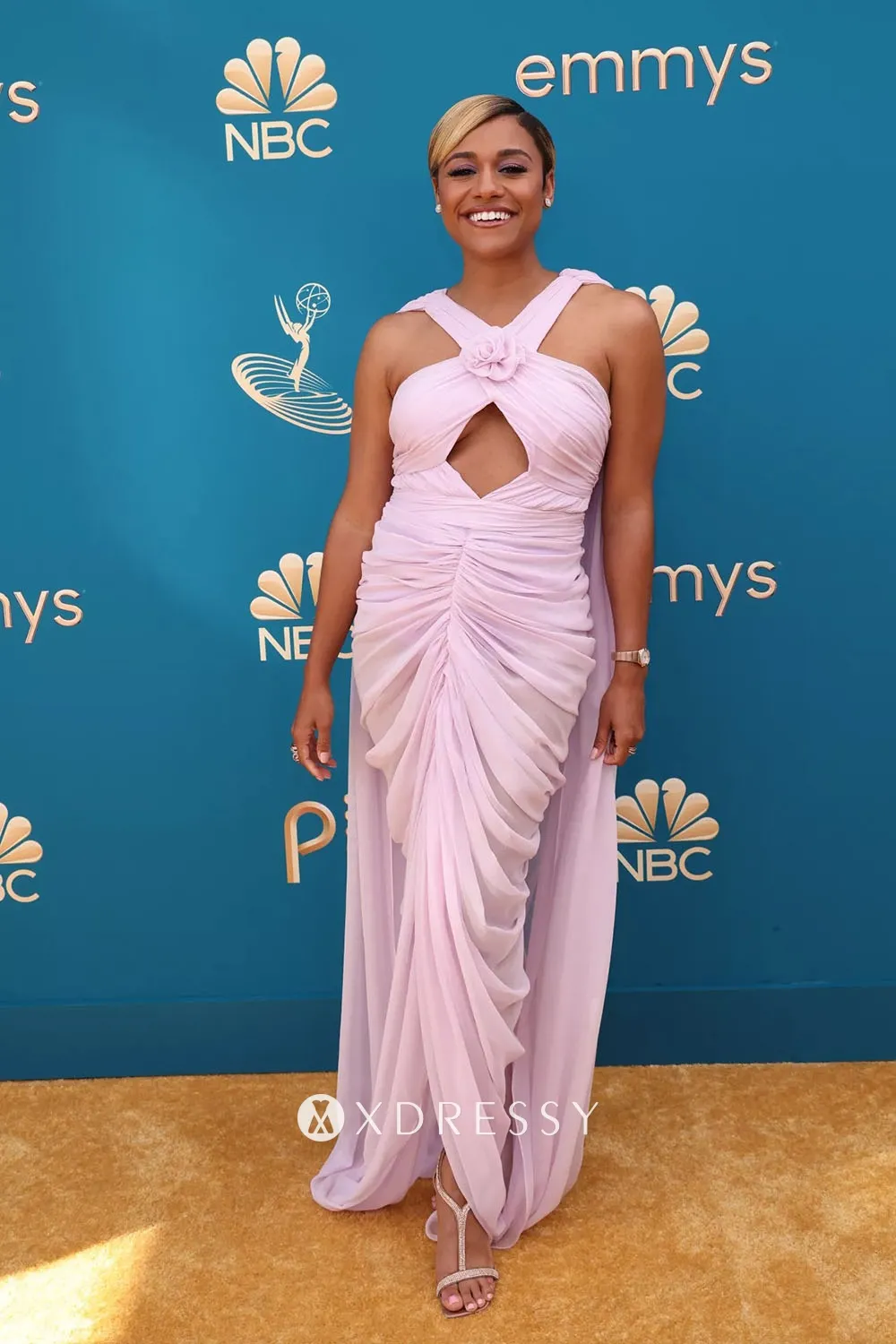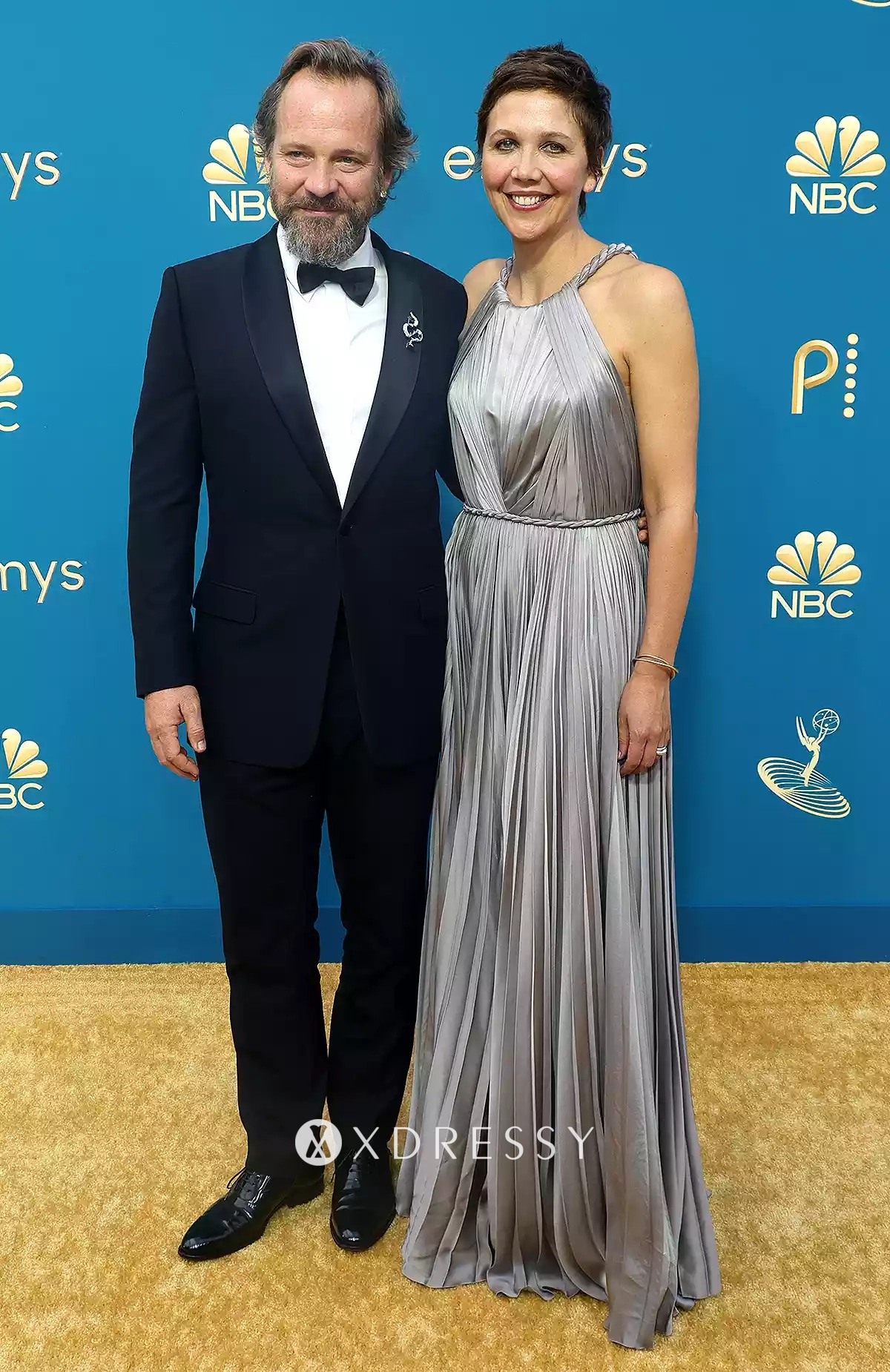 Maggie Gyllenhaal was joined on the red carpet for the 2022 Emmys by her husband Peter Sarsgaard. The silver halter dress detailed with alternating pleated panels to the body before falling into a decidedly delicate pleated skirt.