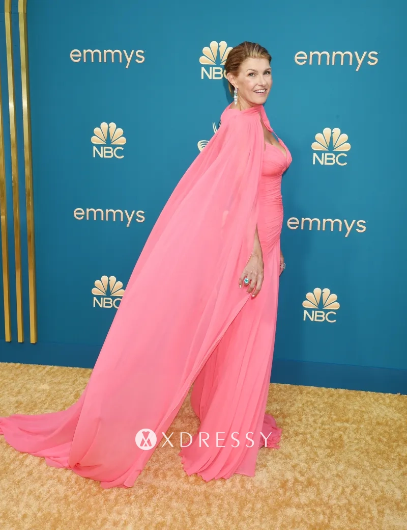 Connie Britton in a stunning neon pink chiffon sweetheart neckline prom gown with a lengthy cape that trailed behind her as she posed for shutterbugs.