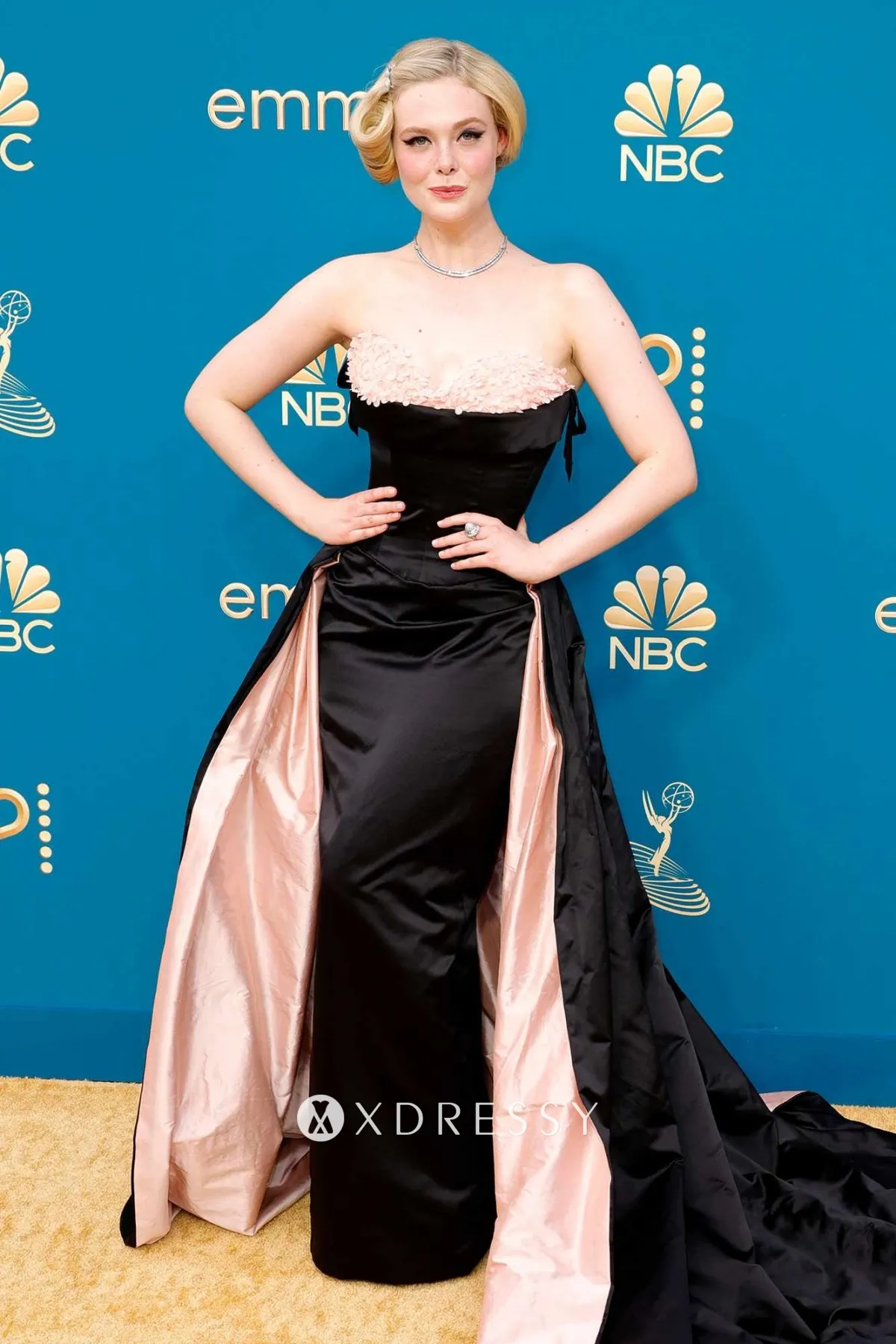 Elle Fanning has made a sophisticated arrival for her first-ever appearance at the 2022 Emmys. She wearing a strapless black sheath gown that featured a sequined pink bust and a pale blush-toned train.