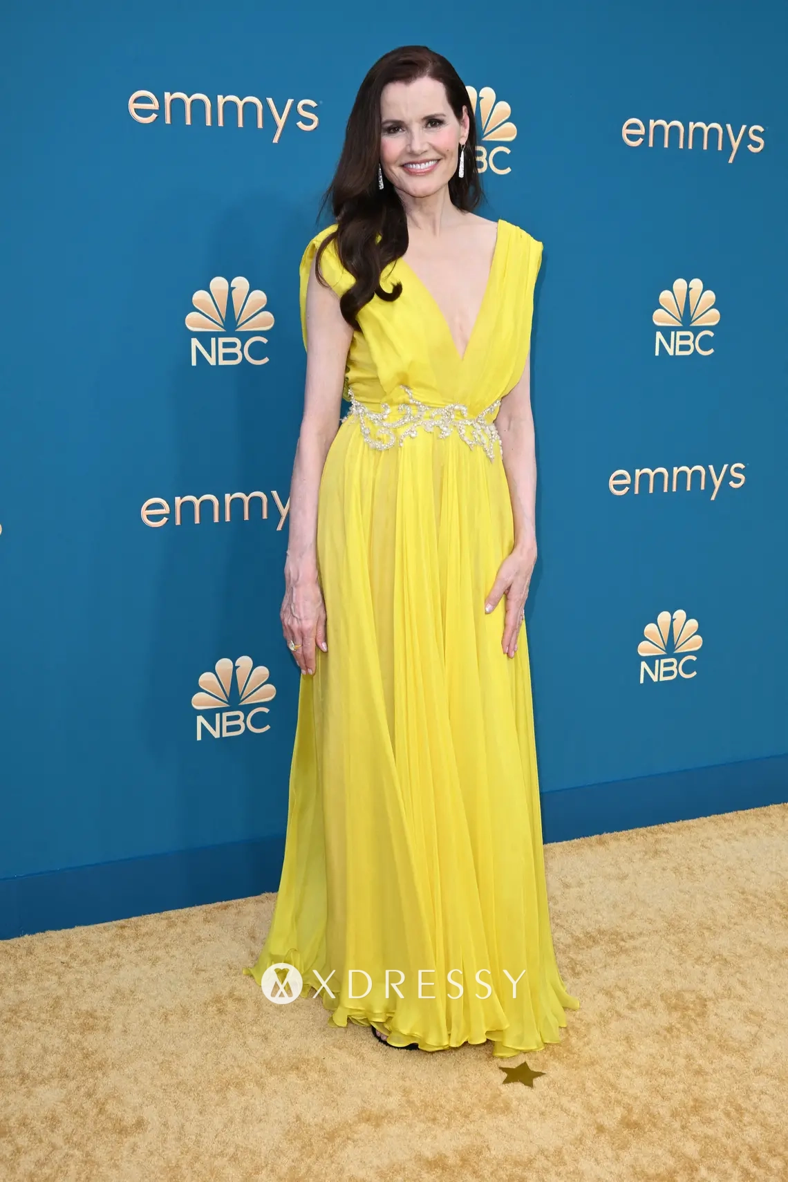 Davis wore a gorgeous bright yellow V-neck beaded waist evening dress that showed off her arms to the Primetime Emmy Awards ceremony.
