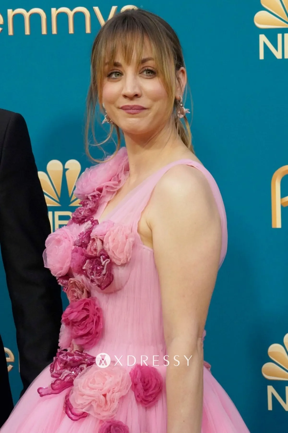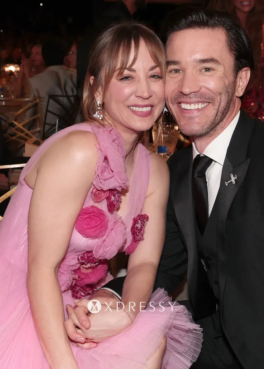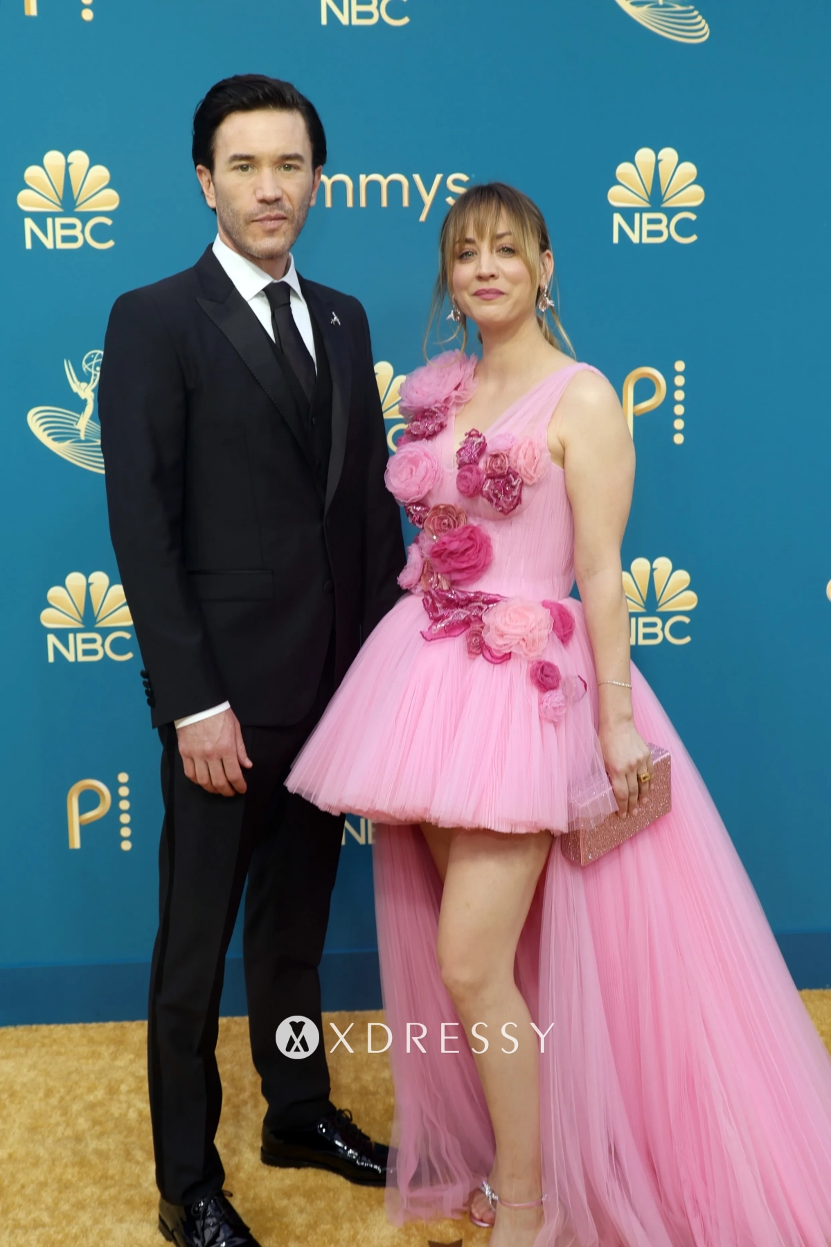 Kaley Cuoco arrived with her boyfriend Tom Pelphrey at her side, she in a pink tulle plunging high-low dress. The hot pink tulle number featured a minidress silhouette with a flared train, topped with 3D floral embellishments in numerous shades of pink.