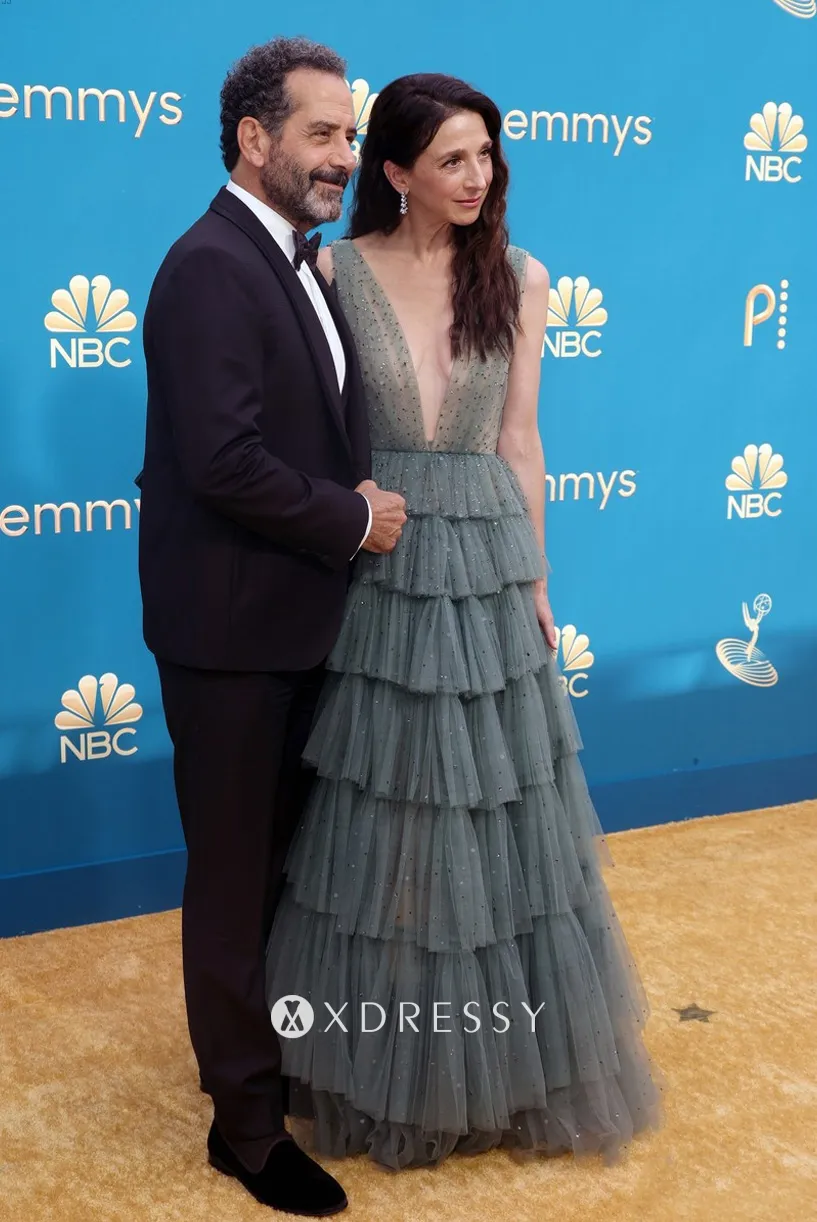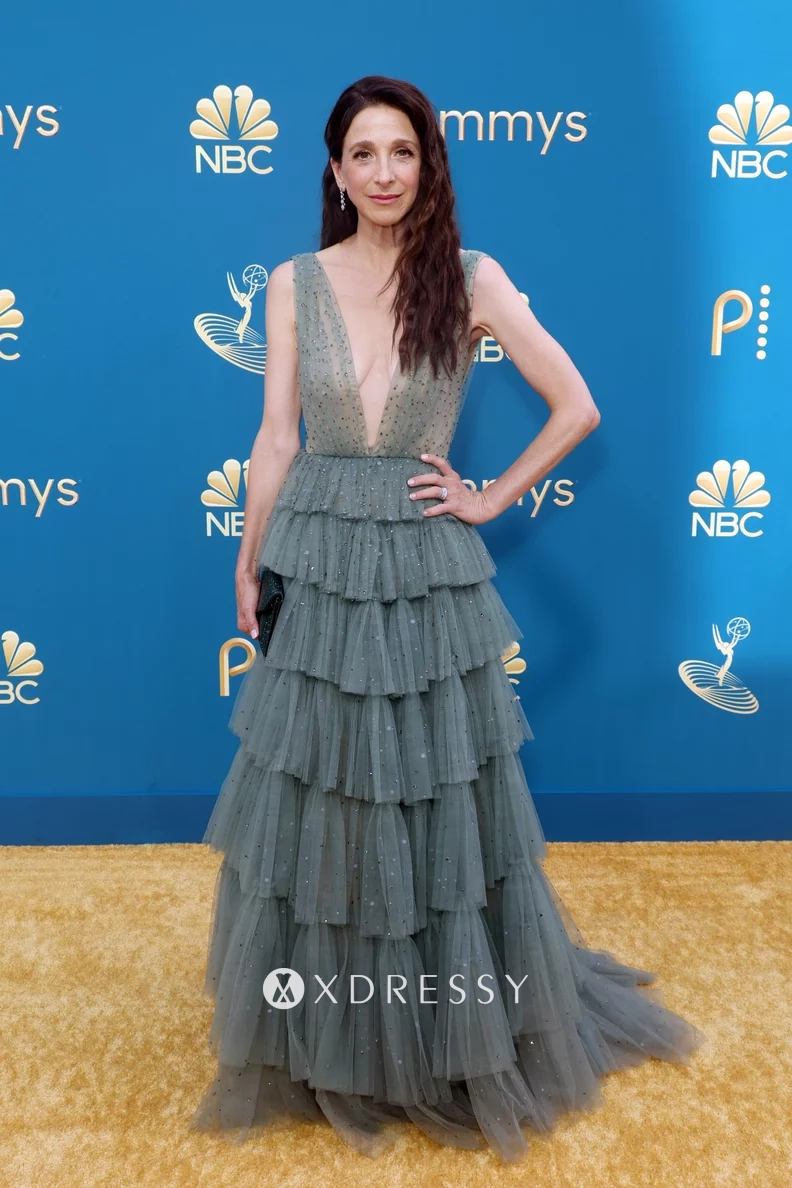 Marin Hinkle stunned in a green beading tulle evening party gown that showed off just a hint of cleavage. The dress featured a tiered skirt and a plunging neckline.