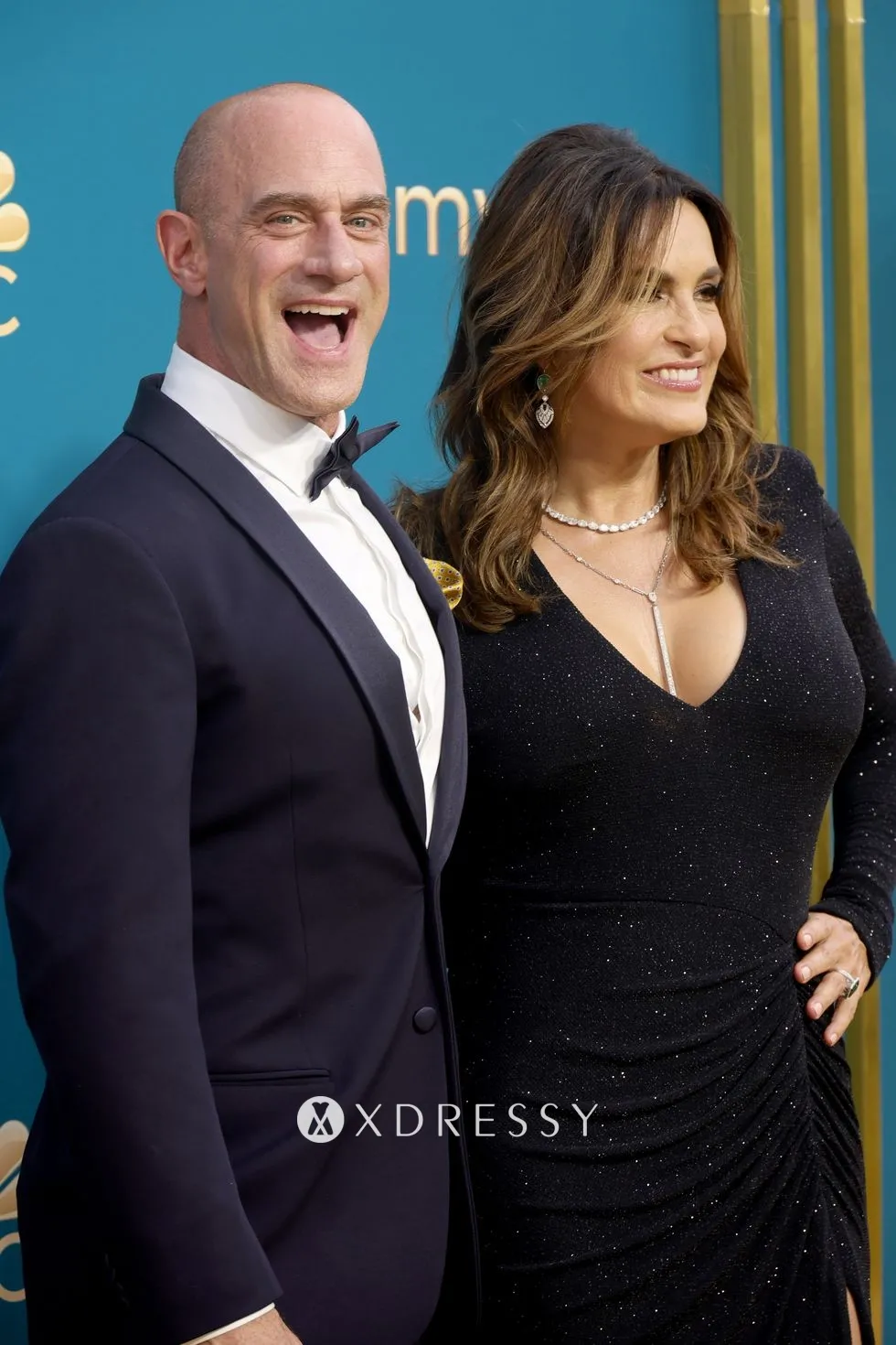 Mariska Hargitay looked beautiful in a figure-hugging black evening dress that featured a daring thigh-split, a plunging neckline, and subtle shimmering detail.The garment had shoulder pads, as well as long cuffed sleeves.