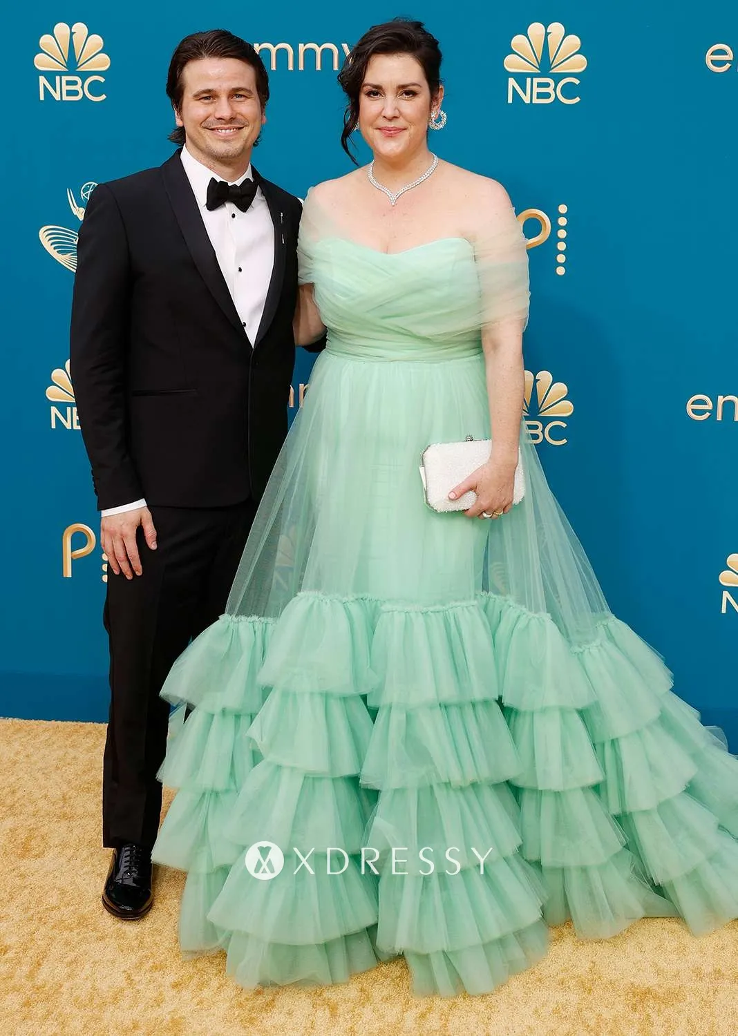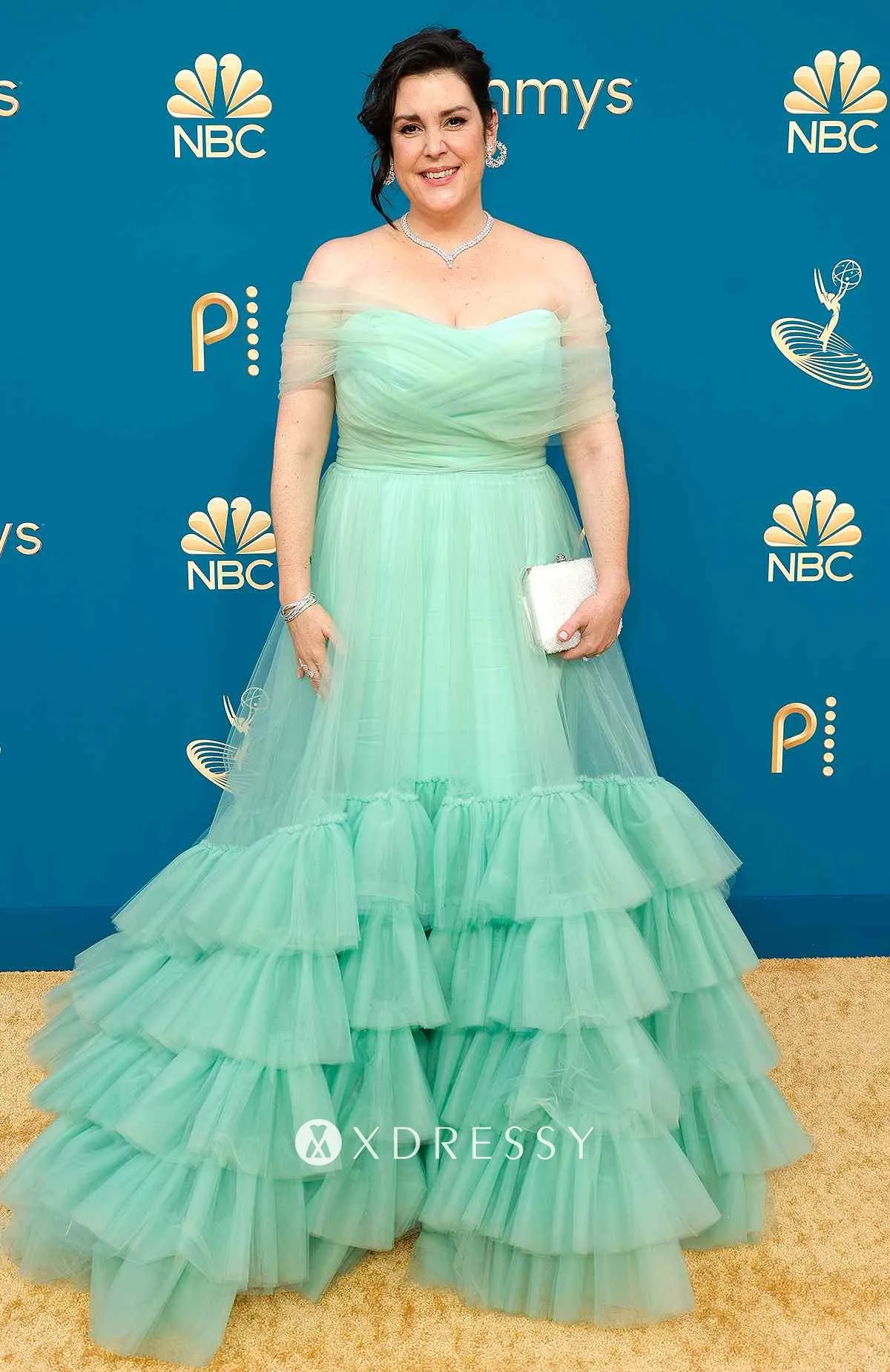 Melanie Lynskey has arrived at the 2022 Emmy Awards in a mint green tulle off-the-shoulder ballgown with a ruffled hem.