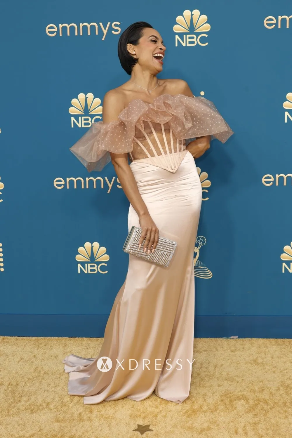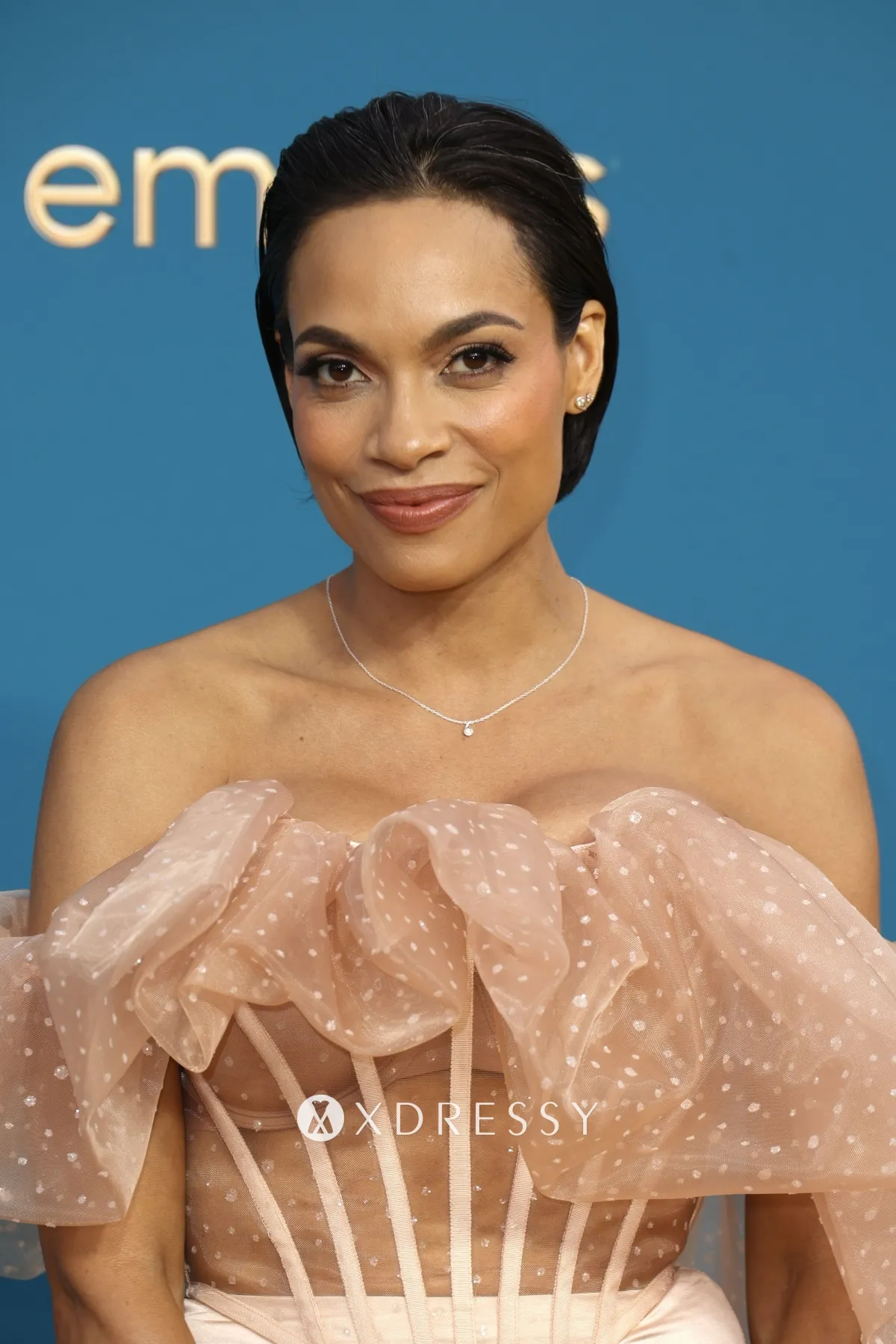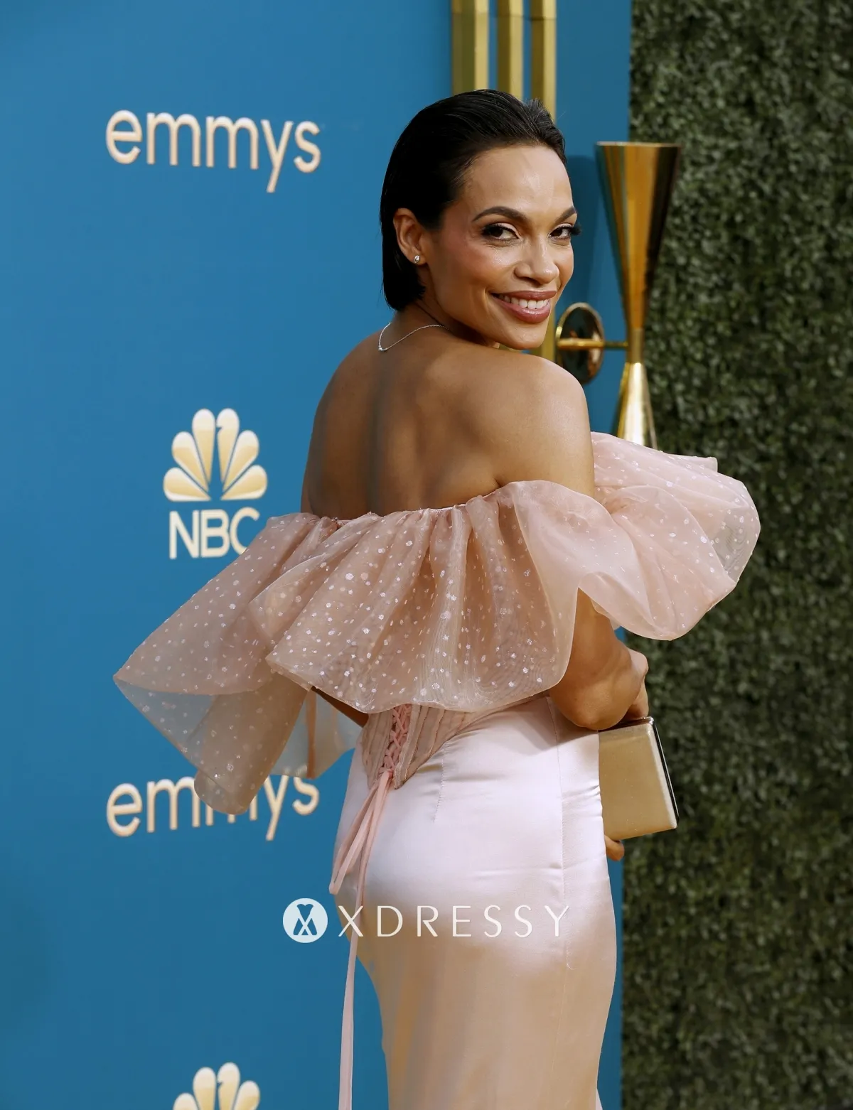 Rosario Dawson stunned as she walked the red carpet when she arrived at the 74th Annual Emmy Awards. She donned a chic pink off-the-shoulder celebrity gown with a contrasting corset top, flaunting her fit physique. The corset bodice was skintight and sheer, showing off her tiny waist and toned figure. The bottom half of the gown featured a skintight satin skirt that hugged her frame perfectly.