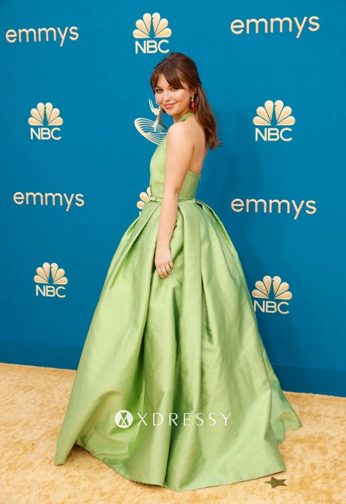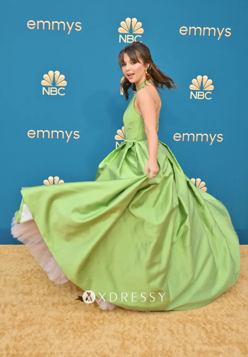 Samantha Hanratty is a vision in this lime green ball gown! The halter-style gown flowed into a plunging neckline before belting at the waist. The gown had a full skirt, and Hanratty's subtle beehive made the look feel vintage.