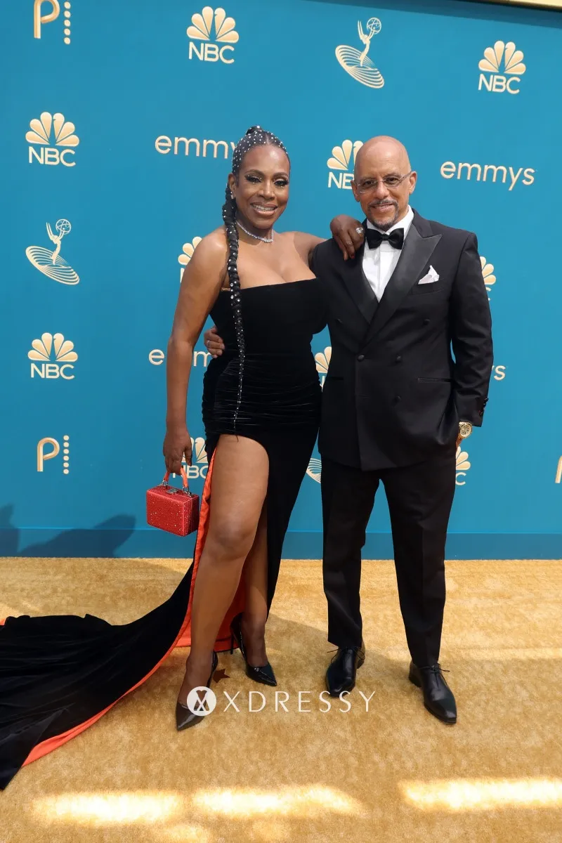 Sheryl Lee Ralph had a standout fashion moment while attending the 2022 Emmy Awards. She wore a strapless black velvet ruched evening gown that had a high slit and a train lined in orange on the opposite side.