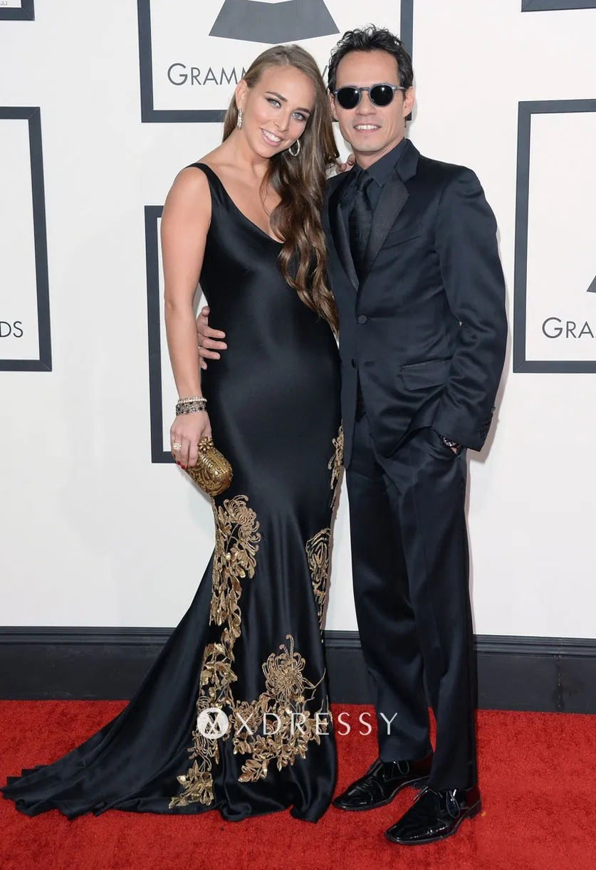 The 45-year-old entertainer Marc Anthony was joined on the red carpet by his girlfriend Chloe Green and is presenting an award during the telecast. Chloe Green wore an elegant black v-neck formal gown adorned with gold lace appliques.