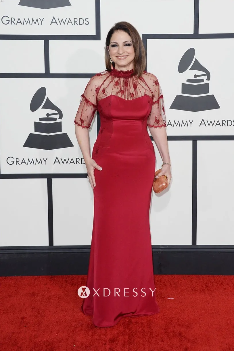 Gloria Estefan wore a red dress at the Grammy Awards 2014 red carpet. The form-fitting gown looked a little too busy at the top with sheer sleeves, scalloped edges, and embroidered flowers all coming up to a high neck in the same colour. She looked absolutely flawless with smokey eyes and pale orange lips.