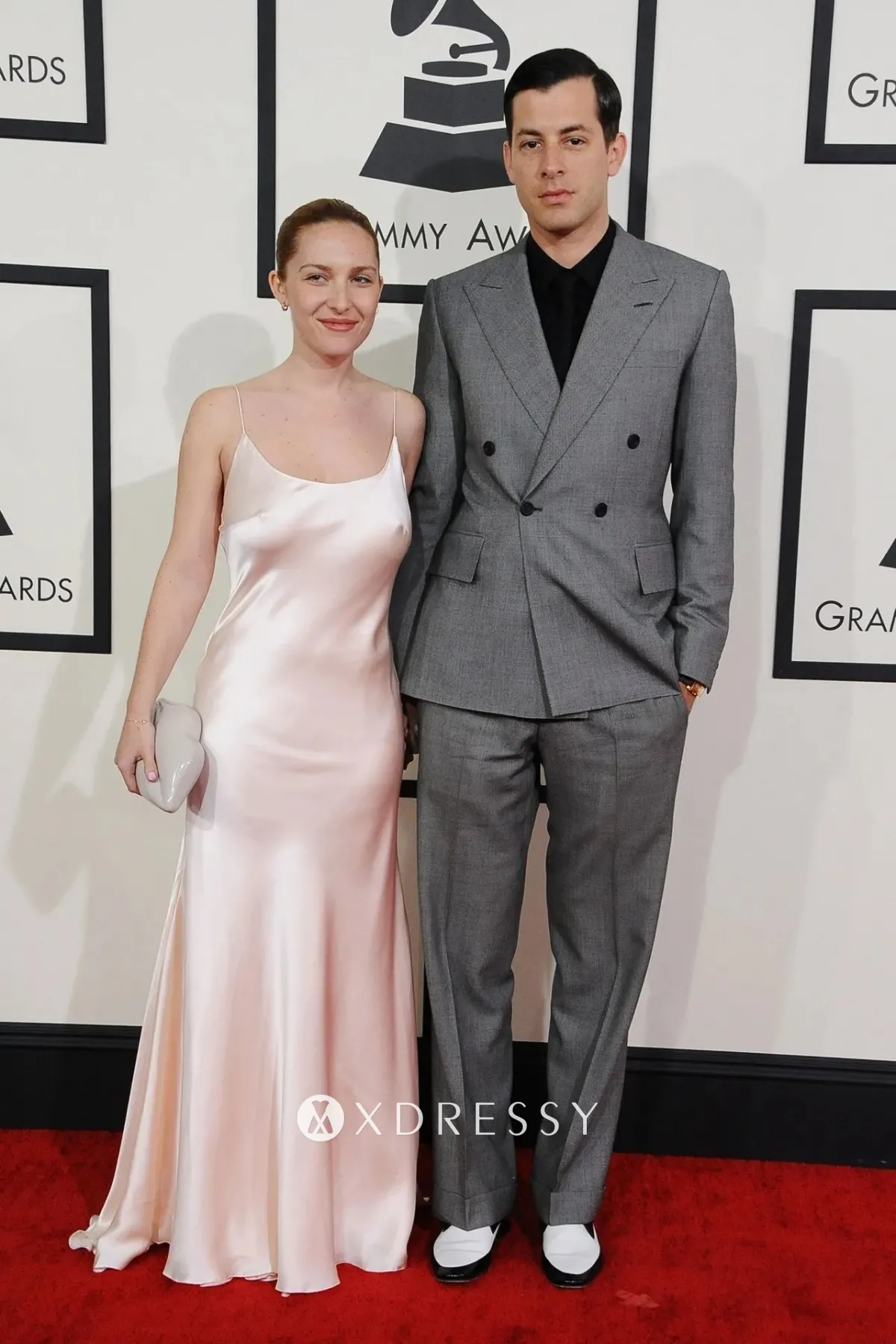 Producer Mark Ronson (R) and Joséphine de La Baume wearing a pink spaghetti straps formal gown attend the 56th GRAMMY Awards at Staples Center on January 26, 2014, in Los Angeles, California.