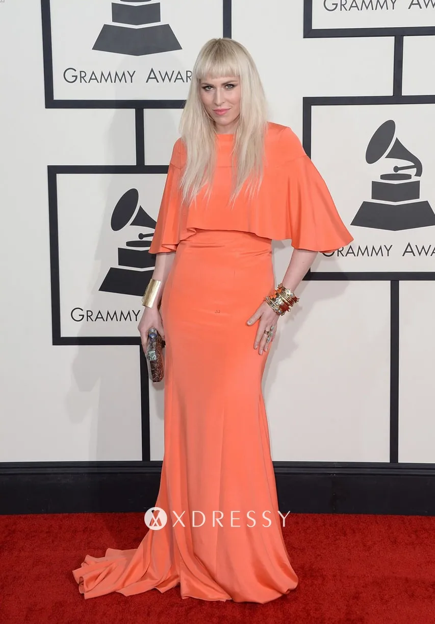 Giuliana Rancic wore an orange lace red carpet dress at Grammys 2014. The dress shows an illusion bodice sleeveless halter neckline, and fitted mermaid silhouette. Absolutely gorgeous and so appropriate for her style!