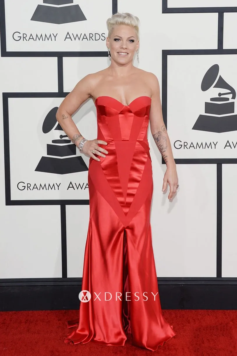 Pink rocks a red strapless mermaid dress on the red carpet at the 2014 Grammy Awards held at the Staples Center on Sunday (January 26) in Los Angeles.