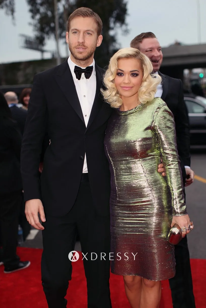 Calvin Harris stands close to his gal Rita Ora on the red carpet at the 2014 Grammy Awards held at the Staples Center on Sunday (January 26) in Los Angeles. Rita is wearing a shiny long-sleeve sheath dress and shoes with Lorraine Schwartz jewelry.
