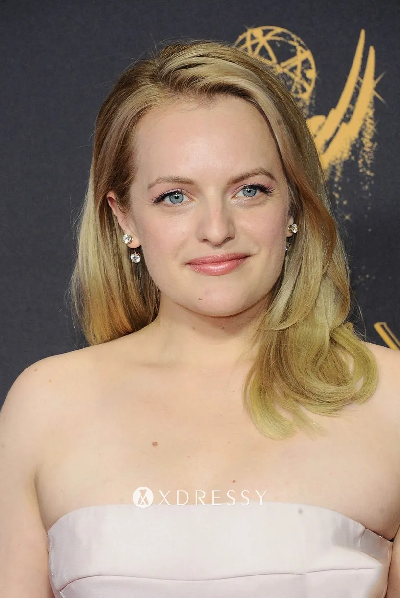 Elisabeth Moss looks pretty in a pink satin strapless A-line short dress at the 2017 Emmy Awards held at the Microsoft Theater on Sunday (September 17) in Los Angeles.