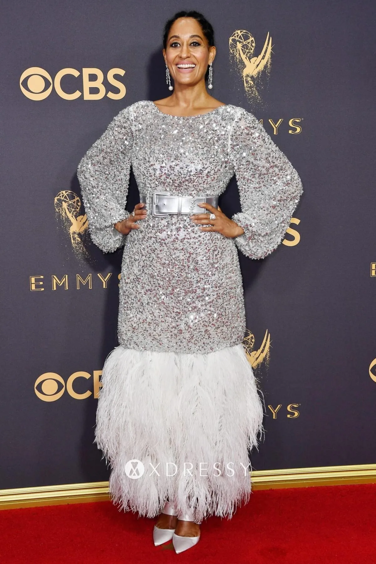 It's the Emmys and on the red carpet, the fabulously chic Tracee Ellis Ross, who also happens to be nominated for lead actress in a comedy series, wore a silver sequin dress, which is a fully embroidered silver tulle number, with oversize sleeves, that ends in a stunning waterfall of feathers.
