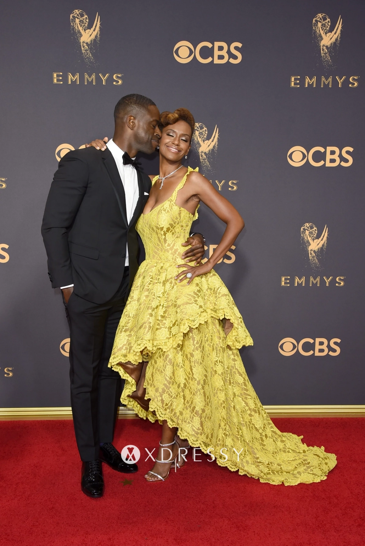Ryan Michelle Bathe in a yellow high-low less-than-glamorous lace evening gown at the 2017(69th) Emmy Awards.