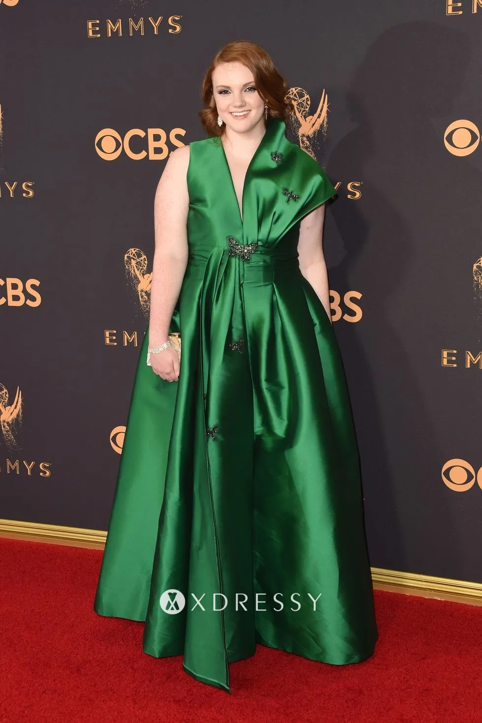 Shannon Purser glams up in a eye-catching green taffeta beaded A-line long gown at the 2017 Emmy Awards.