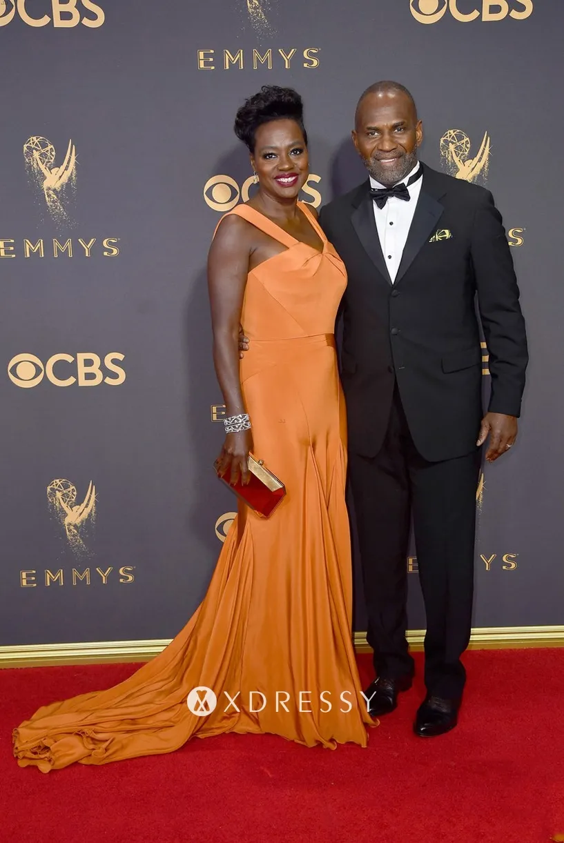 Viola Davis opted for a bright orange evening gown at the 2017 Emmy Awards. The dress was long, clingy, and about as lovely as it gets. Viola added a more pumpkin spice touch with her darker makeup, gold clutch and scarlet nail polish.