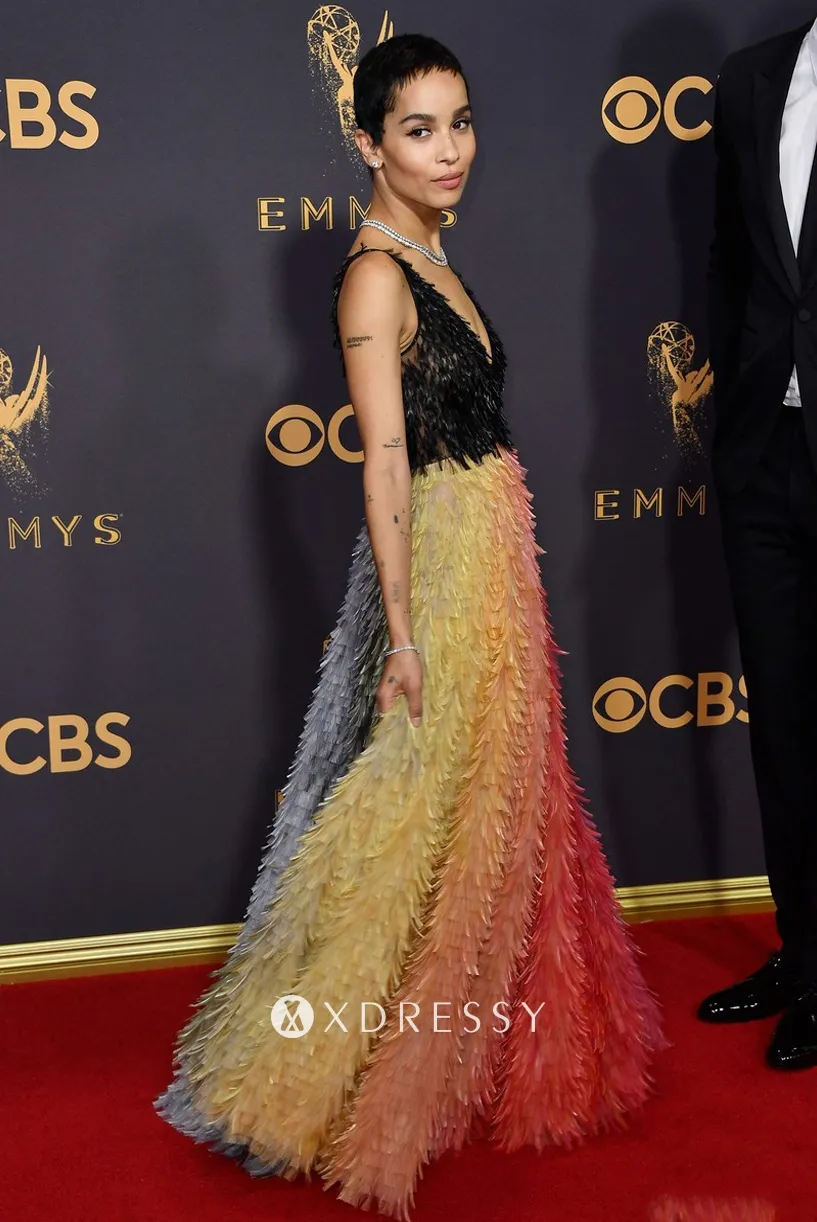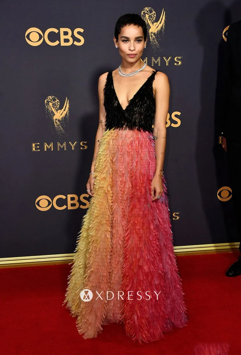 Zoë Kravitz stepped out onto the 2017 Emmys red carpet in a luxury feather dress. This breathtaking v-neck formal gown seemed to change color as she moved, thanks to its rainbow ombre feathered finish.