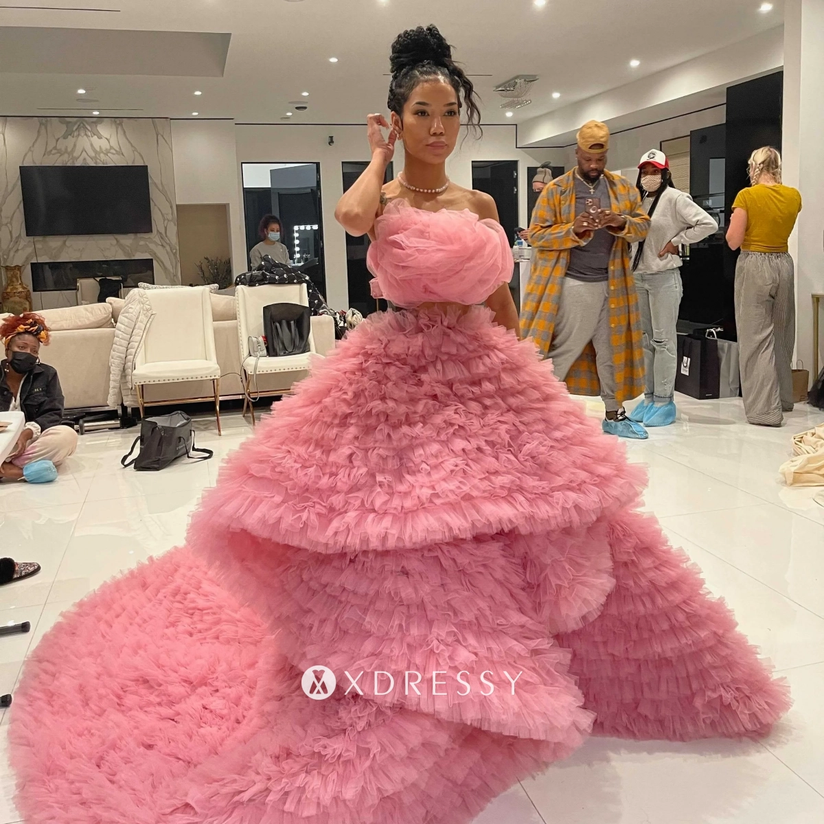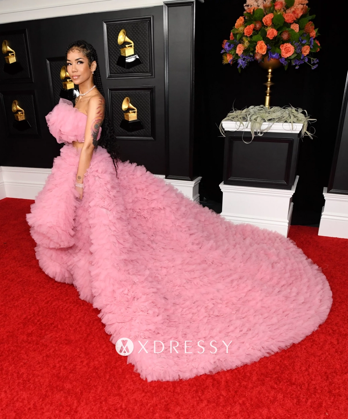 At the 2021 Grammys, Debi Novia wore a unique pink floral print strapless short dress with a long train.