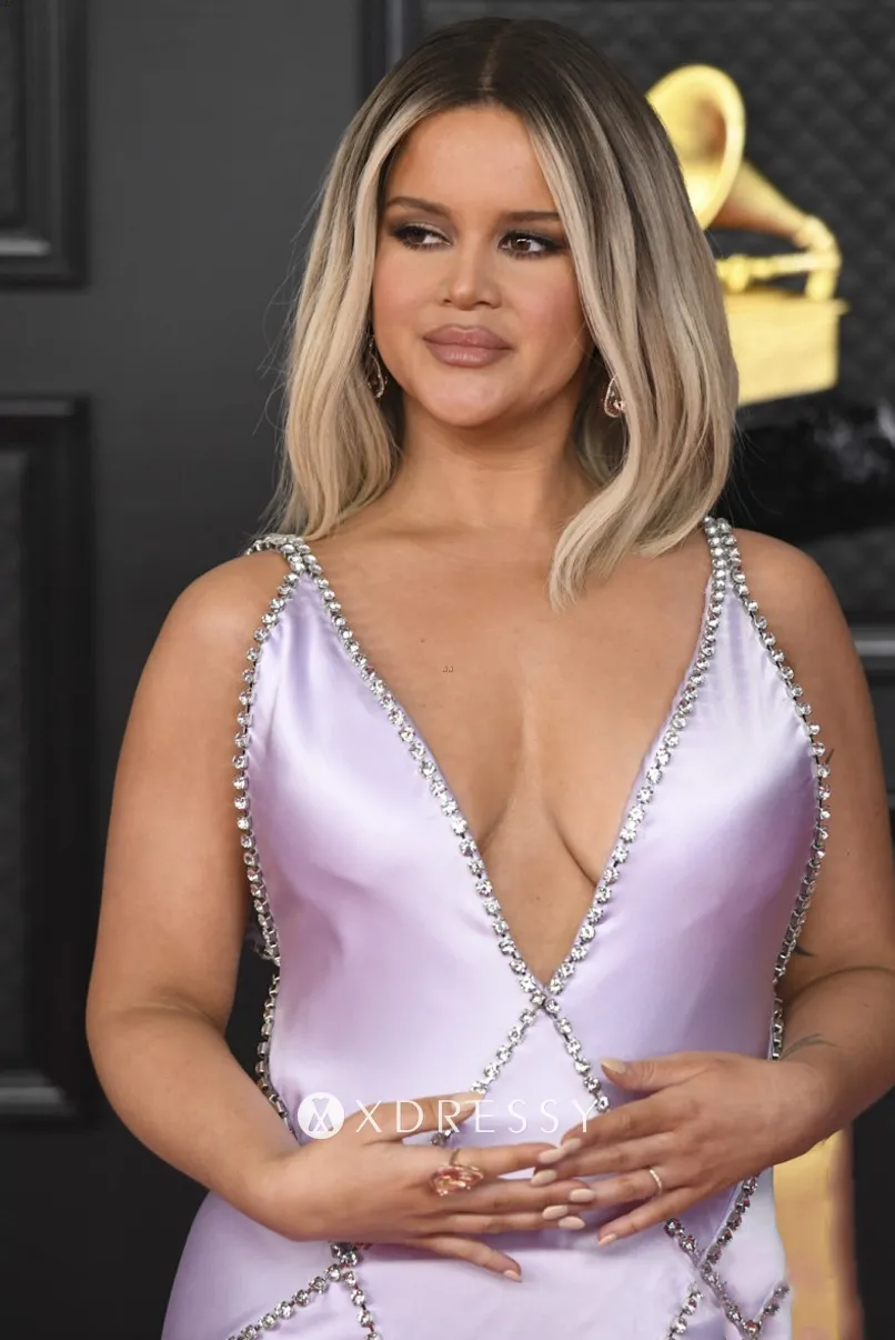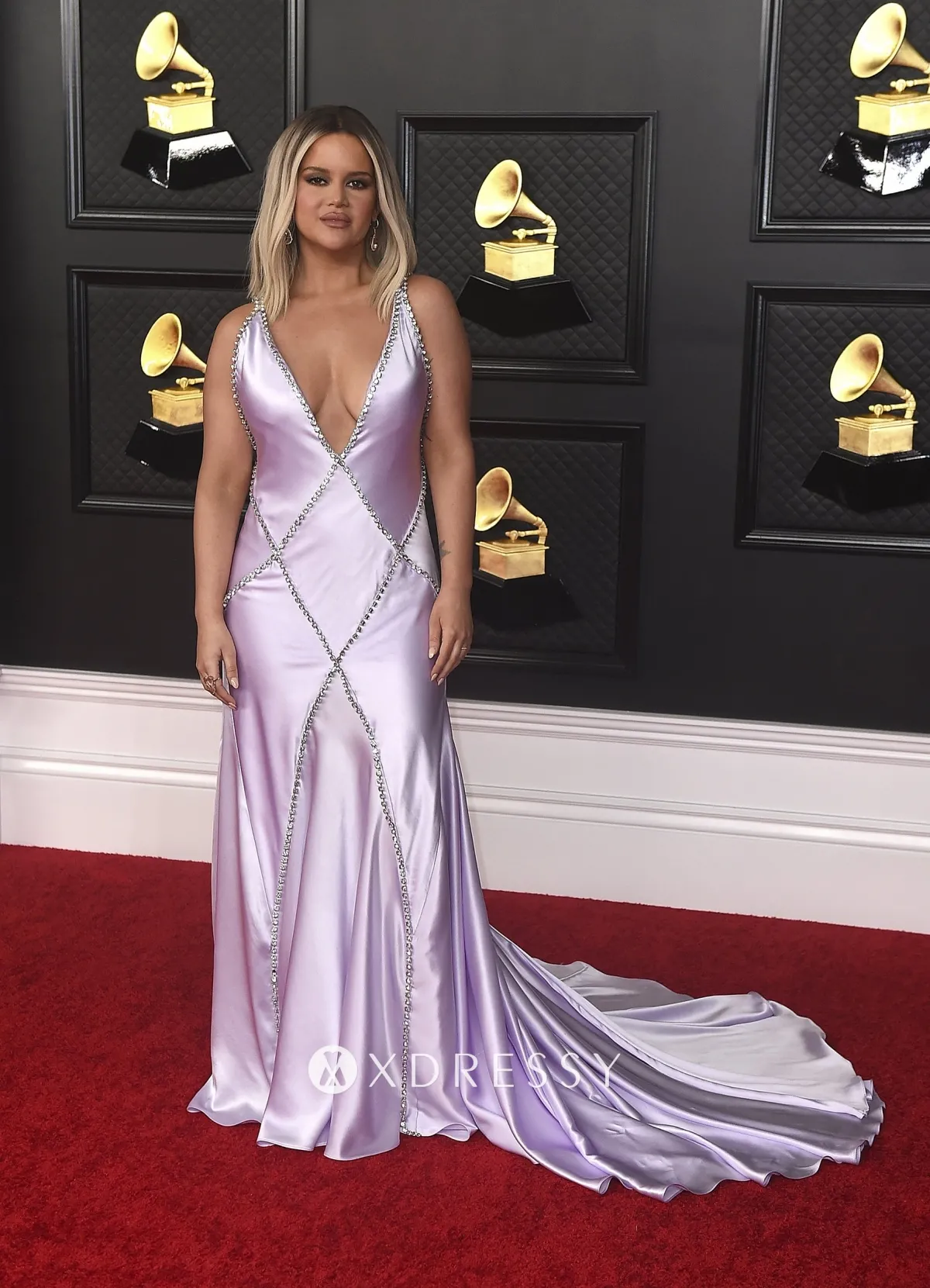 Maren Morris wowed on the red carpet, wearing a beautiful silk lavender spaghetti straps plunging V-neck evening dress lined with silver crystals. The elegant dress draped elegantly to highlight her curves, culminating in a short train following her.