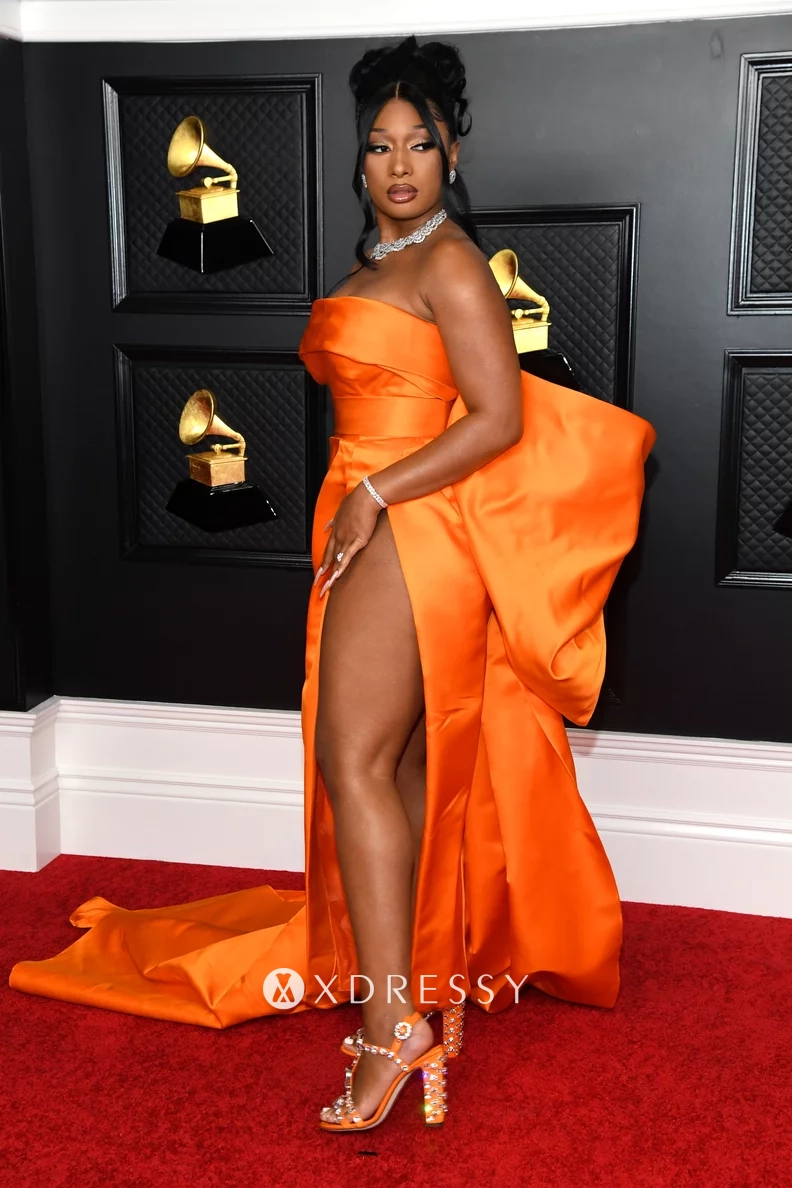 Megan Thee Stallion looked absolutely gorgeous wearing an amazing orange gown at the 2021 Grammy Awards. The strapless neon orange evening gown belted above the waist featuring a thigh-high slit, dramatic train and voluminous bow at the back.