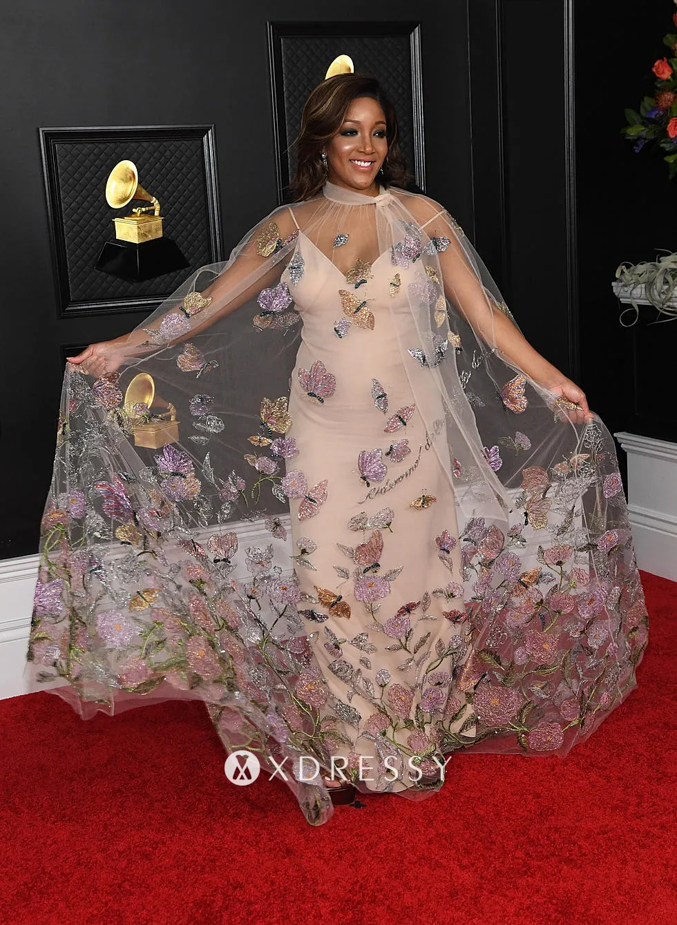 American country music artist Mickey Guyton, who is a first-time nominee and is going to perform at Grammys 2021, arrived at the award ceremony looking her fashionable best. She wears a transparent cape adorned with exquisite flowers and butterflies over a tan dress.