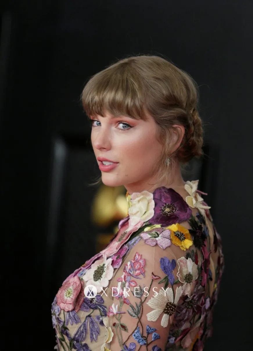 At the 63rd annual Grammys, Swift's look is a stunning embodiment of all her hard work. Taylor Swift wore a semi-sheer long-sleeve mini dress covered in embroidered flowers for the Grammys red carpet ·